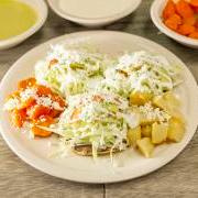 Deliciosa Gorda de Masa doradita con Manteca, Base de Frijol y Papa, Carne deshebrada, Lechuga, Tomate, Aguacate, Queso Fresco y Papitas Fritas, Zanahorias en Vinagre y Crema aparte