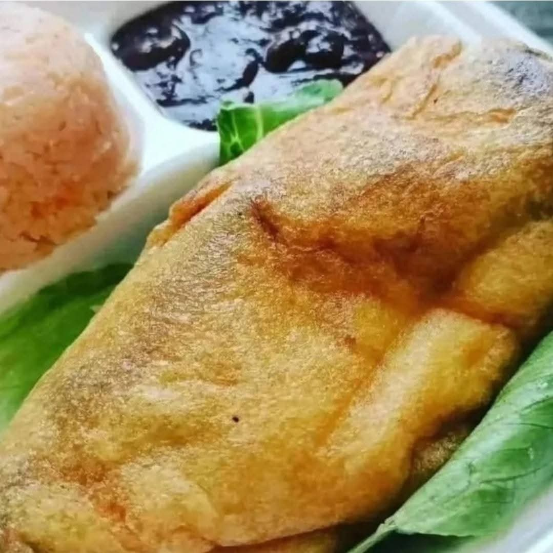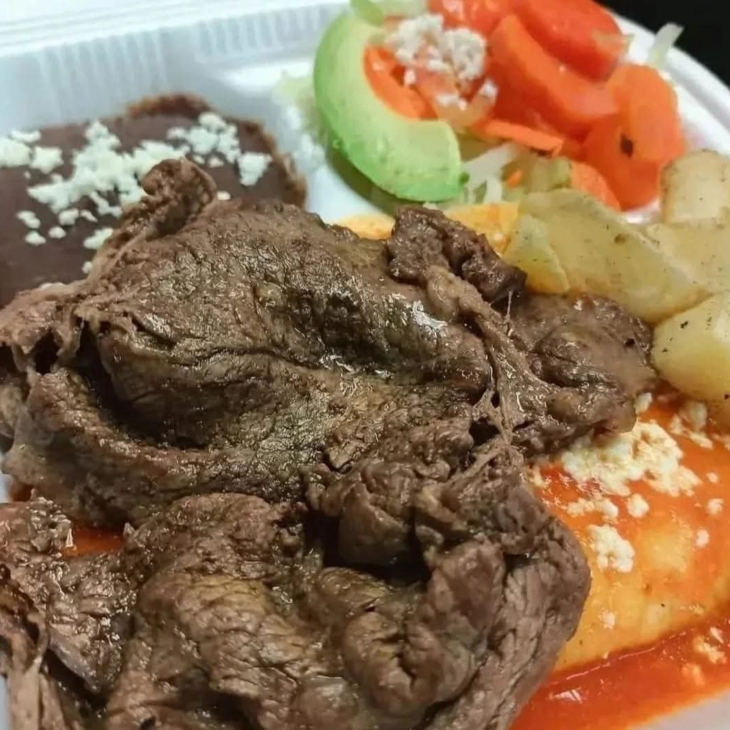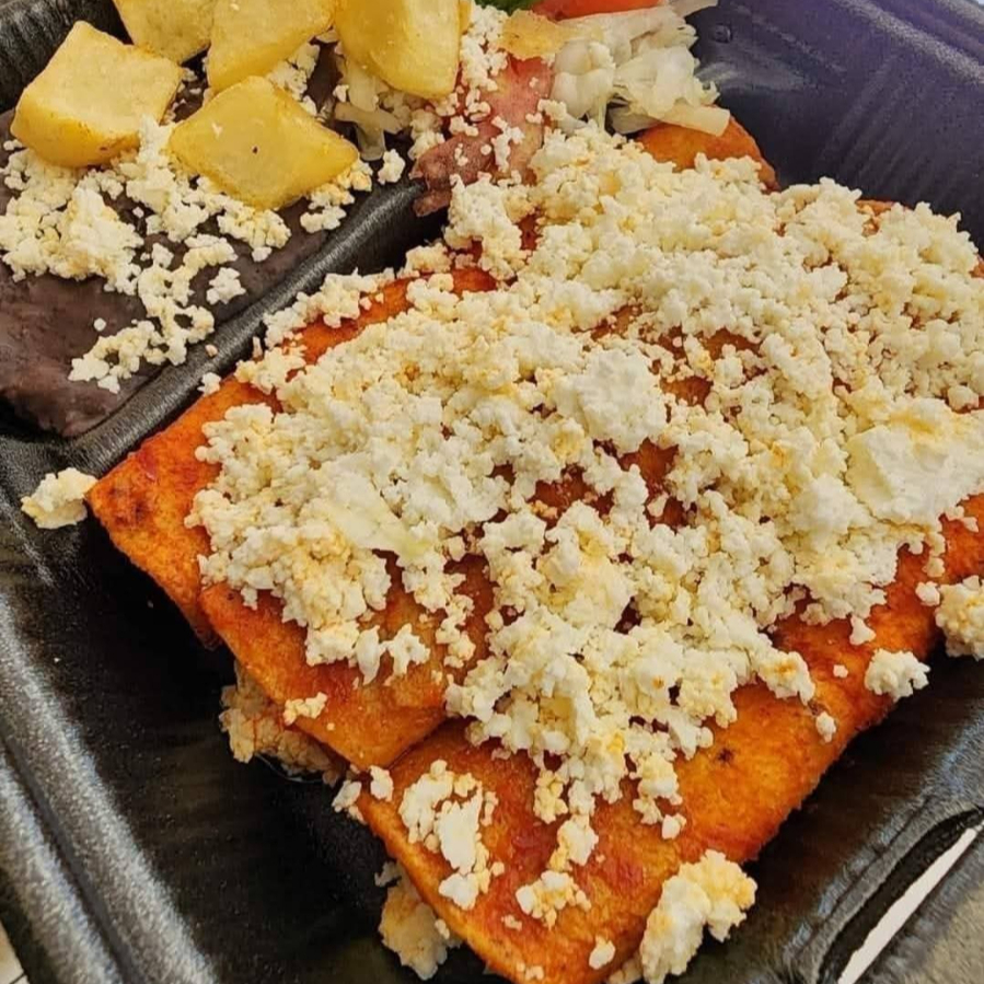 4 Tortillas rellenas de Queso Fresco, bañadas en Salsa de Tomate, acompañadas de Frijolitoas, Lechuga, Tomate, Aguacate, Zanahorias en Vinagre y Papas Fritas