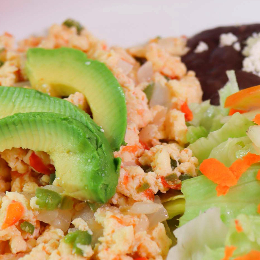 3 huevos en revueltos sin grasa! 1 complemento a tu elección para mixear ! acompañados de Frijolitos, Ensalada Verde y Salmas