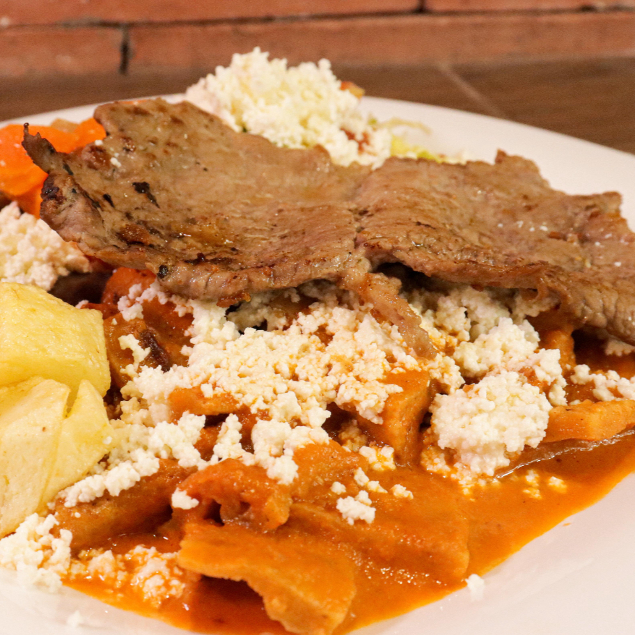 120 GR DE BISTEC SALTEADITOS CON CHILE TOMATE Y CEBOLLA EN SALSITA DE TOMATE, INCLUYE DOS GUARNCIONES Y TORTILLAS RECIEN HECHAS