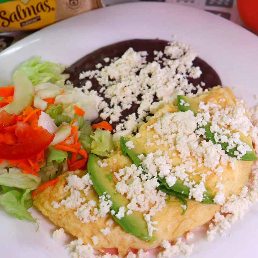 2 huevos en tortilla sin grasa! rellenos de 2 complementos a tu elección! acompañados de Frijolitos, Ensalada Verde y Salmas