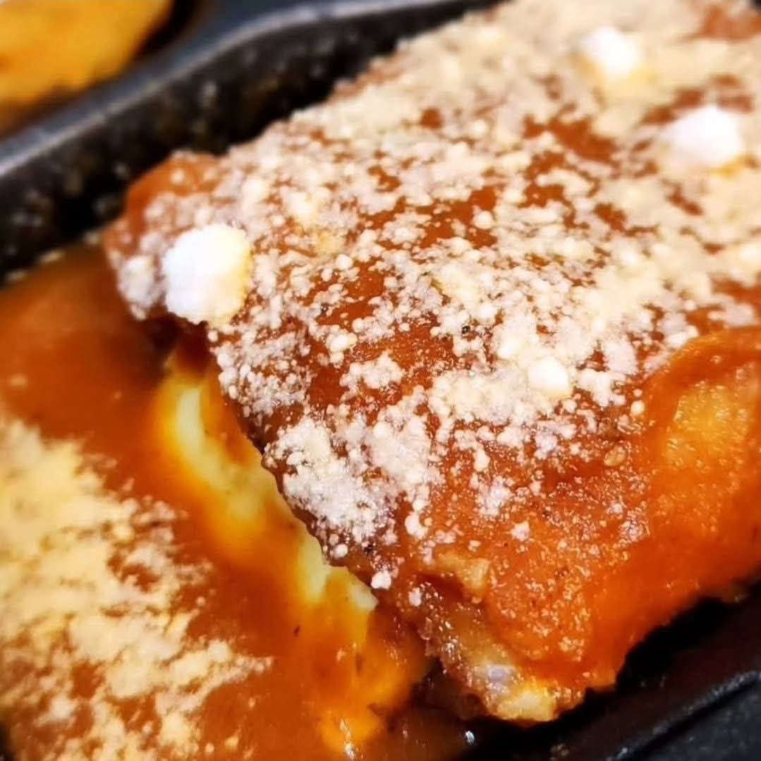 120 GR DE MILANESA DE POLLO EMPANIZADA RELLENA DE QUESO MANCHEGO Y JAMON DE PAVO, BAÑADA EN SALSITA DE TOMATE Y PARMESANO, DOS GUARNICIONES A ELEGIR, TORTILLAS RECIEN HECHAS
