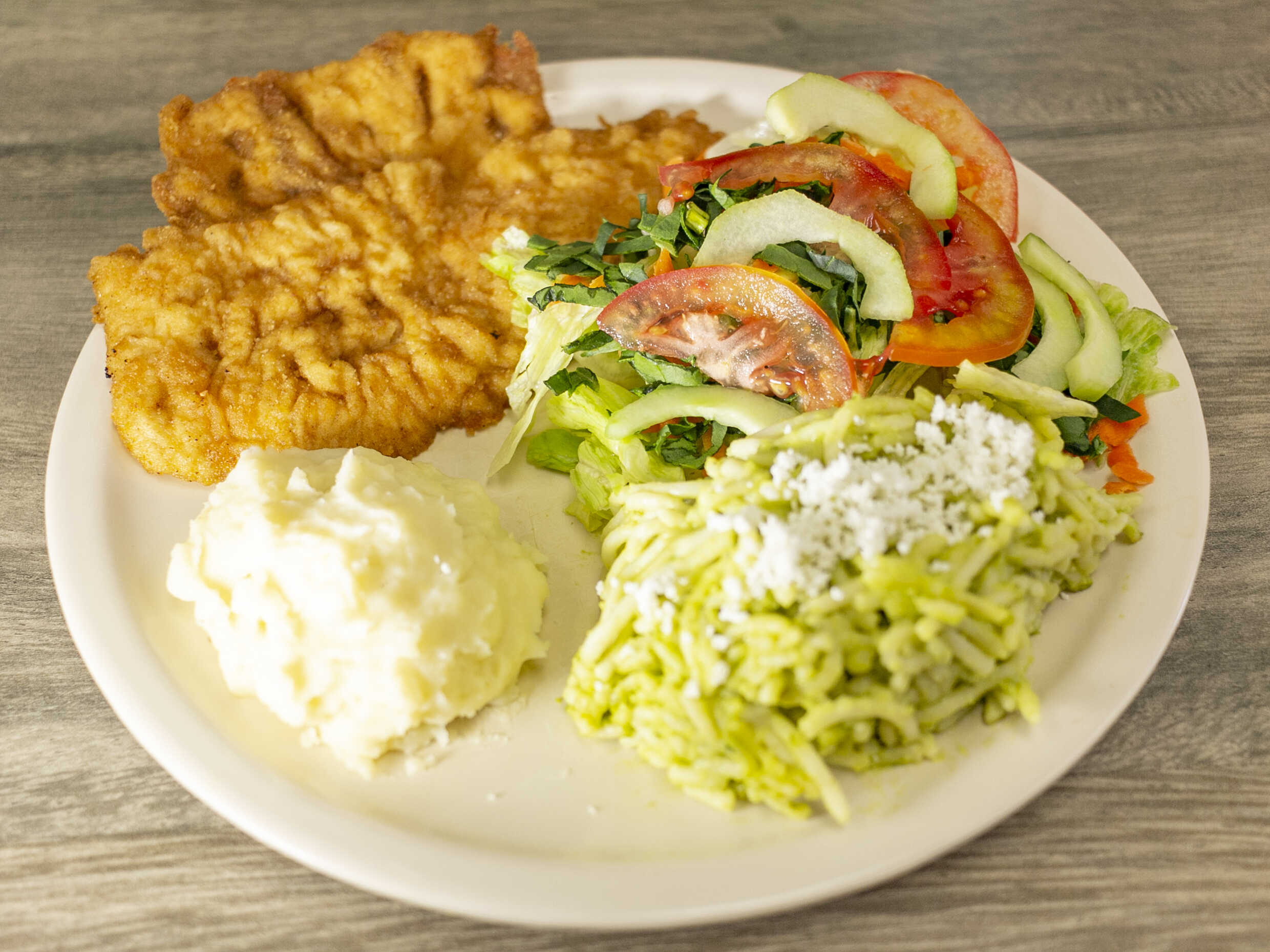 120 Gramos de milanesa de pollp empanizada, acompañado de dos guarniciones.
