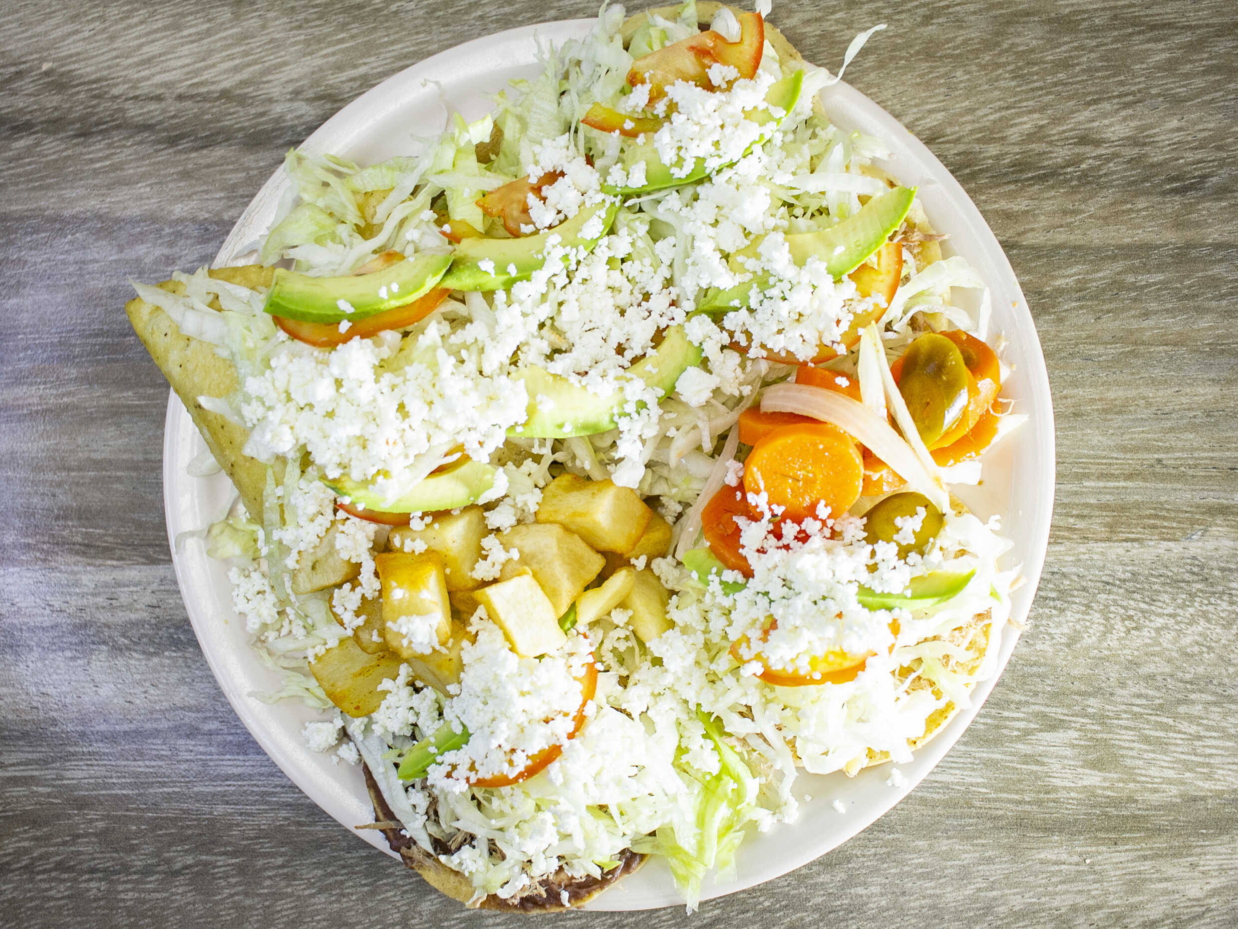5 Tostaditas base de frijolitos y papa, carne deshebrada, preparadas con lechuga, tomate, aguacate, queso, crema, papas fritas y deliciosas zanahorias en vinagre.
