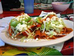 4 Tortillas recien hecha bañada en salsa de tomate, frijolitos, queso, crema, aguacate y papitas fritas.