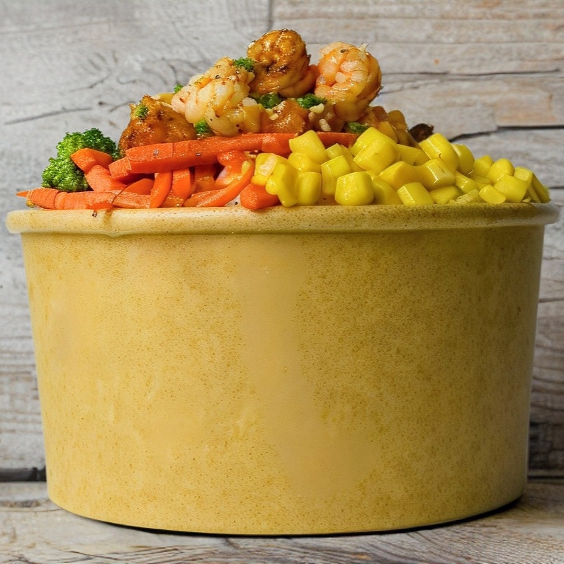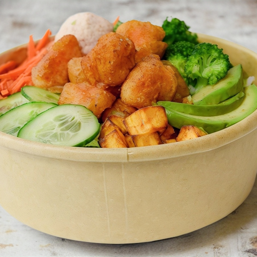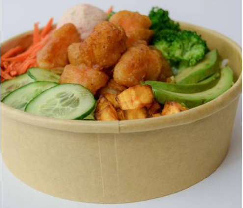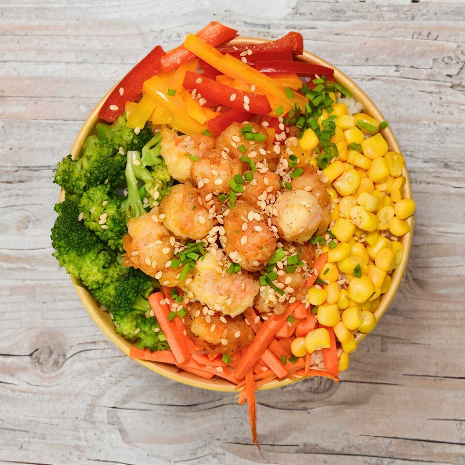 Proteina: Palomitas de Camarón Toppings: brócoli, zanahoria, elote, cebollín Salsas: mayonesa spicy Crunchs: ajonjolí