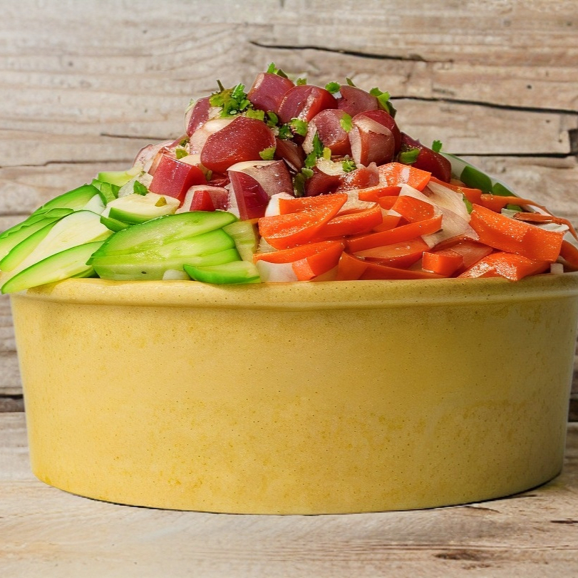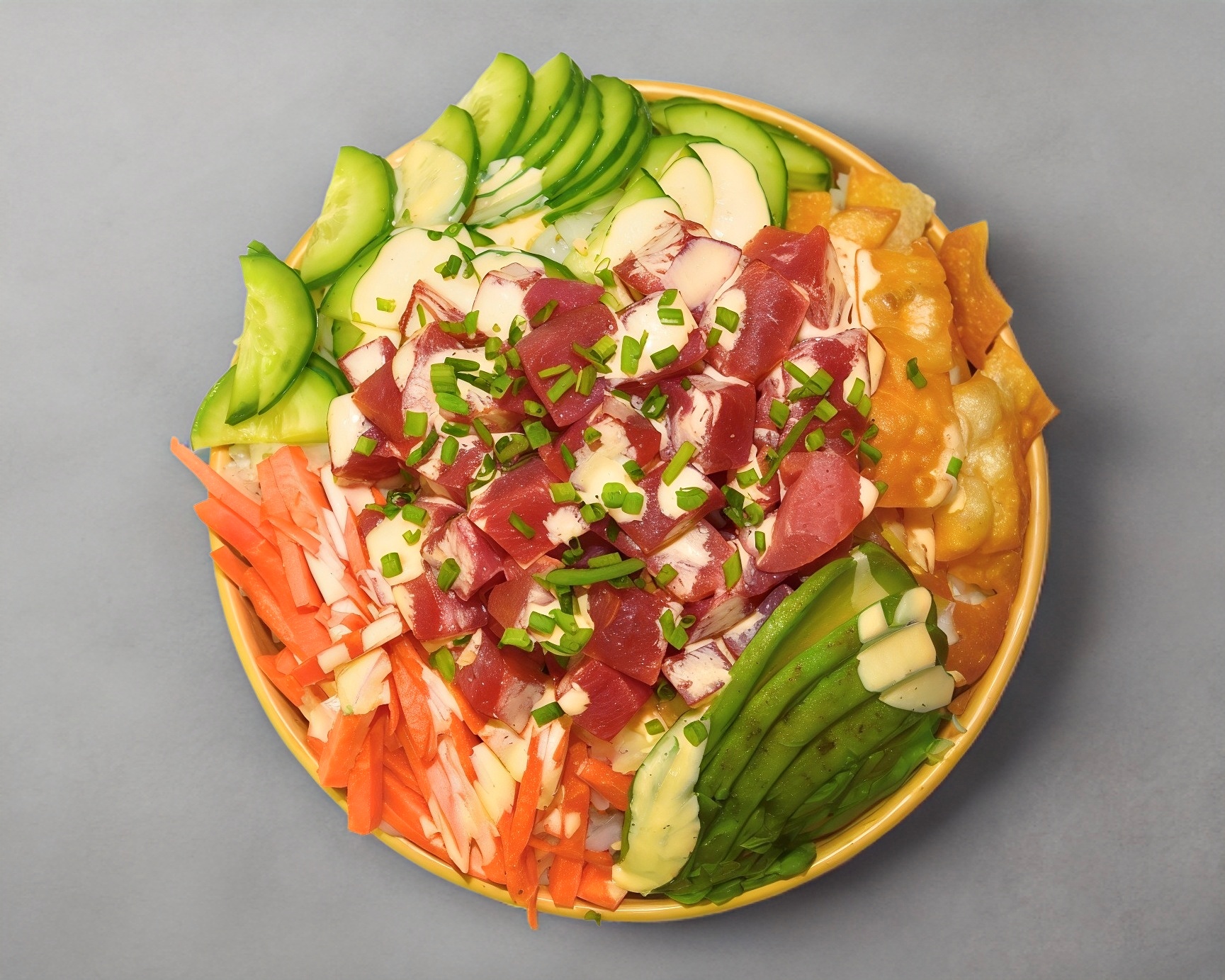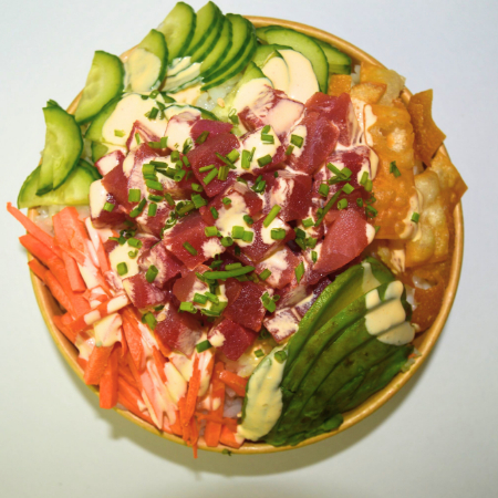 Proteina: spicy tuna Toppings: zanahoria, pepino, cebollín Toppings especiales: aguacate Salsas: spicy mayo, ponzu Crunchs: wonton