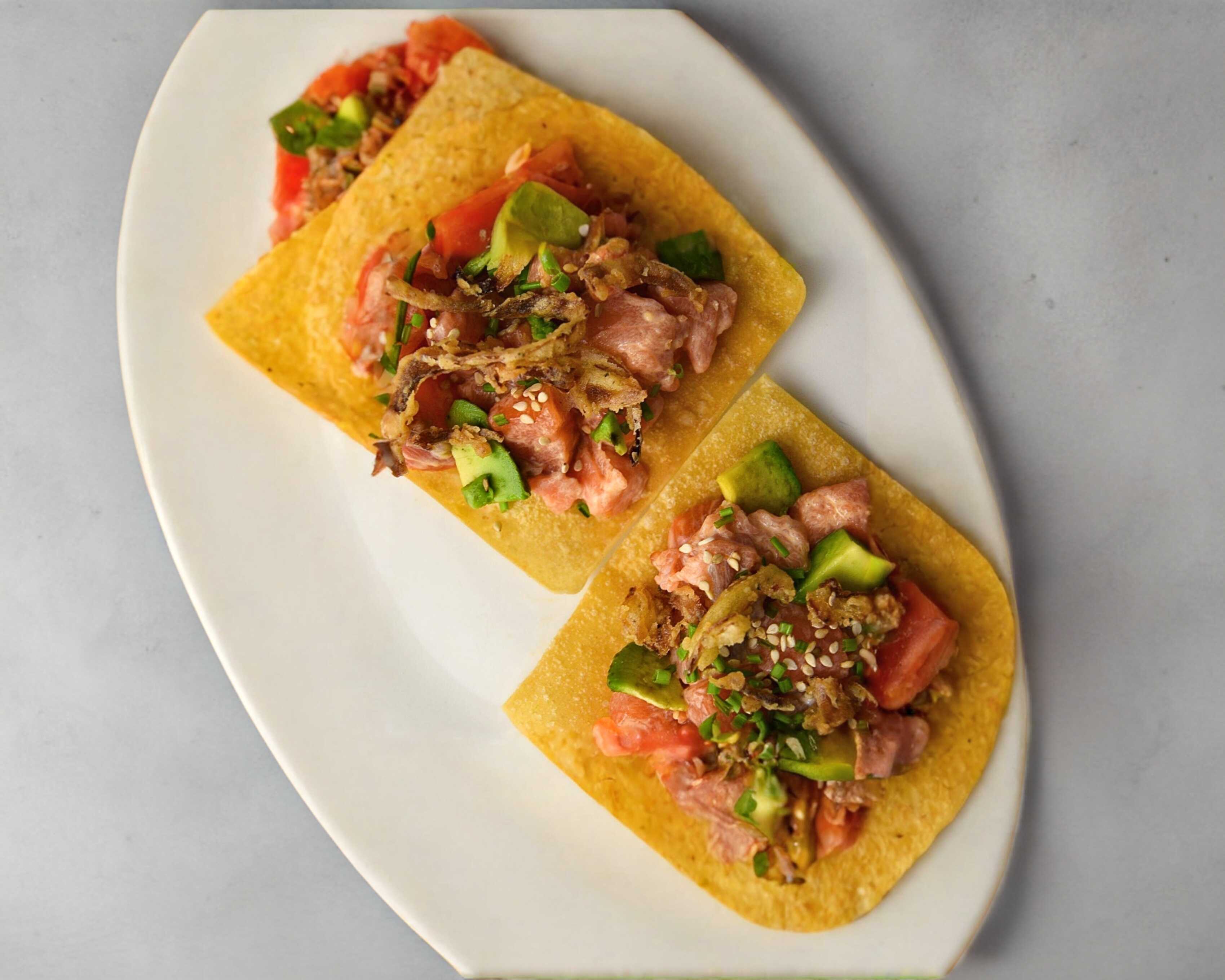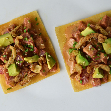 Preparadas sobre una base de tostadas de wonton, cubiertas con un fresco y picante atún, acompañadas de cebolla caramelizada y aguacate.