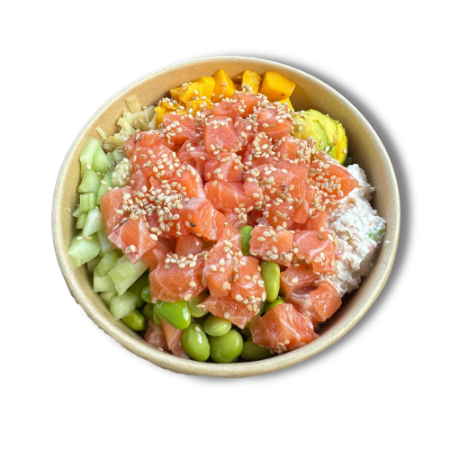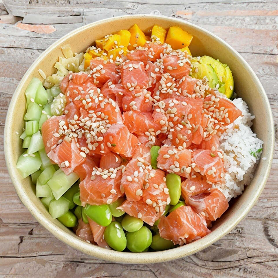 Salmon , aguacate, tampico, edamame, pepino, jengibre encurtido, Mango Crunchs: ajonjolí