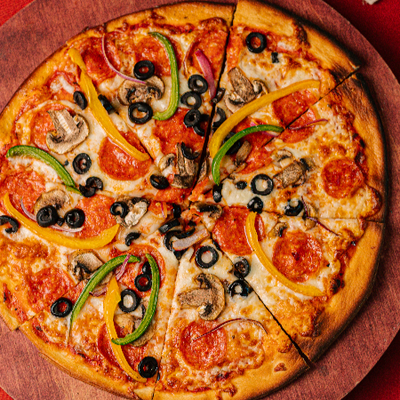 Pizza de 16" 8 rebanadas; en base de tomate y queso mozzarella con pepperoni, champiñones, aceitunas, pimientos y cebolla.