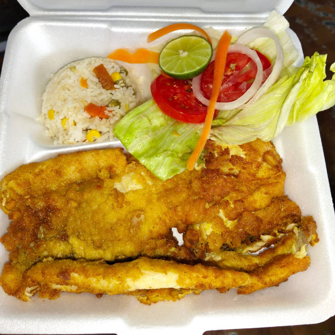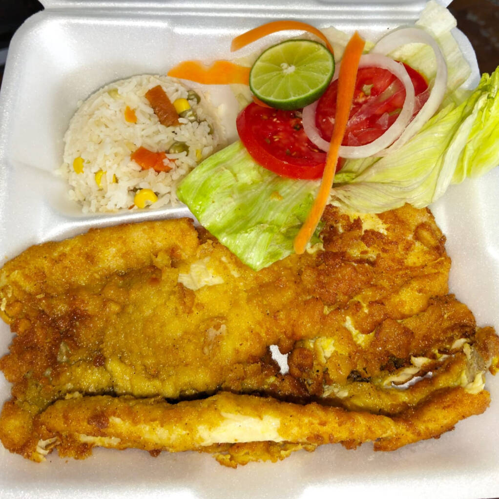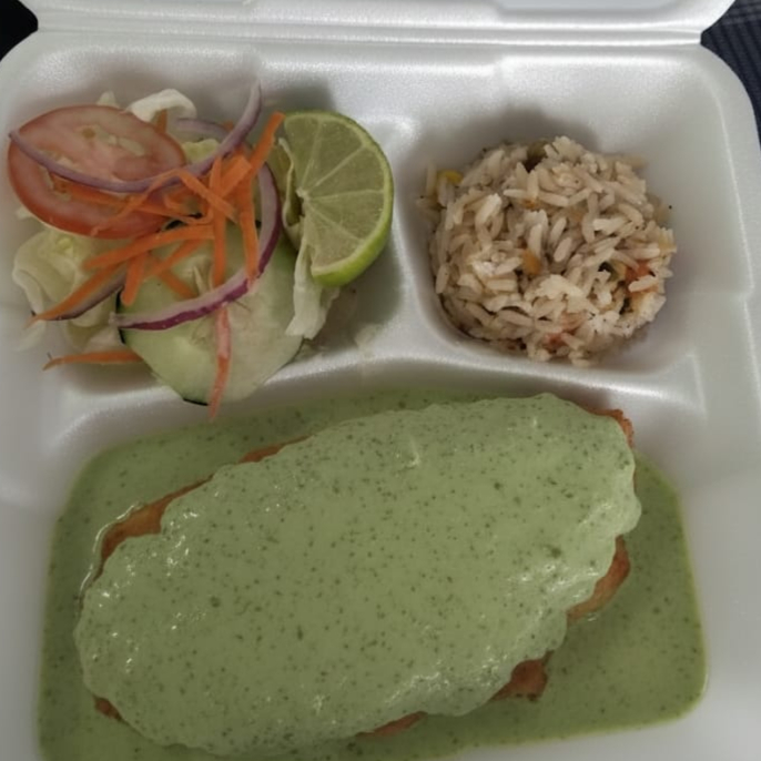 Filete de pescado empanizado en pan molido, bañado en salsa de cilantro fresco, ideal para disfrutar . acompañados de ensalada (lechuga, tomate, cebolla morada, pepino, zanahoria rallada) incluye arroz a la jardinera, salsa pulpito, limón y tortillas