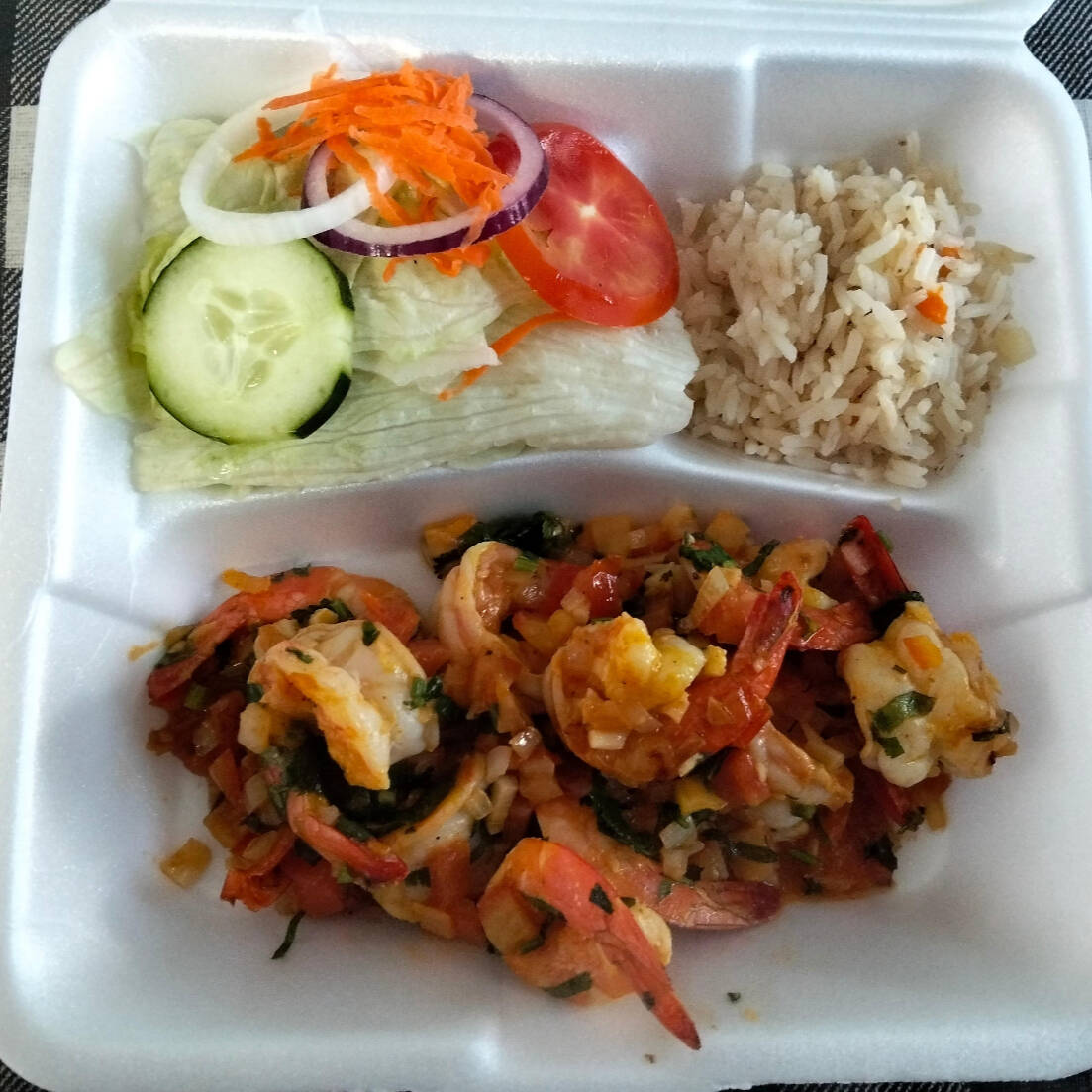 Camarones abiertos tipo mariposa salteados en cebolla, ajo y mantequilla con tomate, cebolla y cilantro incluye arroz a la jardinera, ensalada (lechuga, cebolla morada, tomate, pepino y zanahoria rallada), limón, salsa pulpito y tortillas