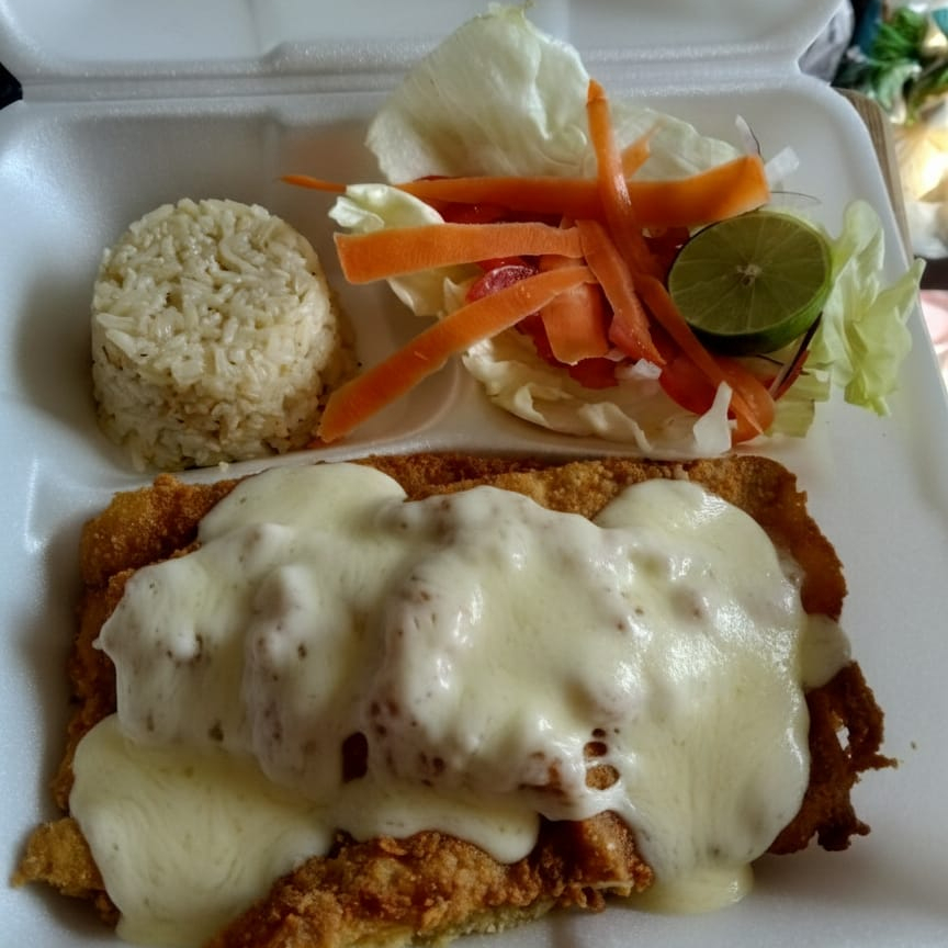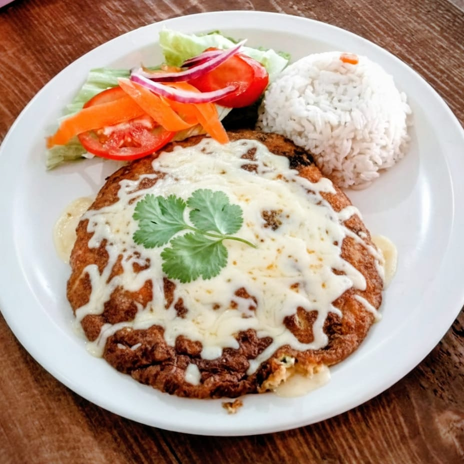 Filetes gratinados cubiertos con una capa dorada de queso fundido, perfecto para realzar el sabor incluye ensalada (lechuga, tomate, cebolla morada y zanahoria rallada), arroz, tortillas y limón
