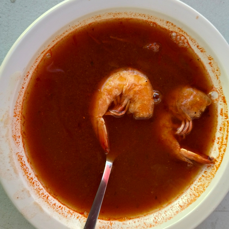 Caldo de camarones con cascara y cocteleros, incluye porción de arroz a la jardinera, salsa pulpito y tortillas