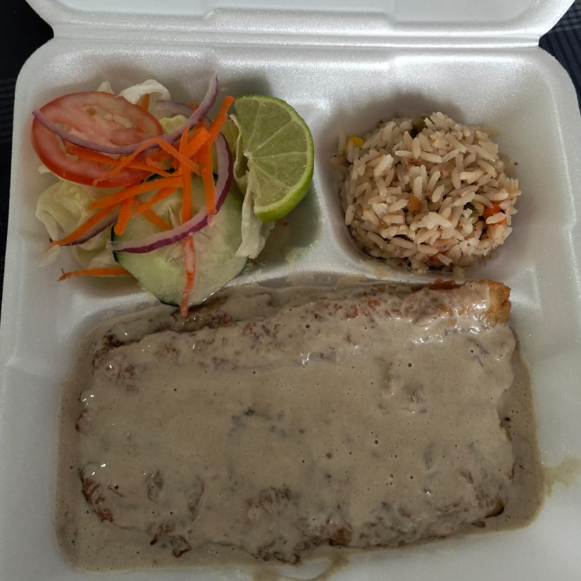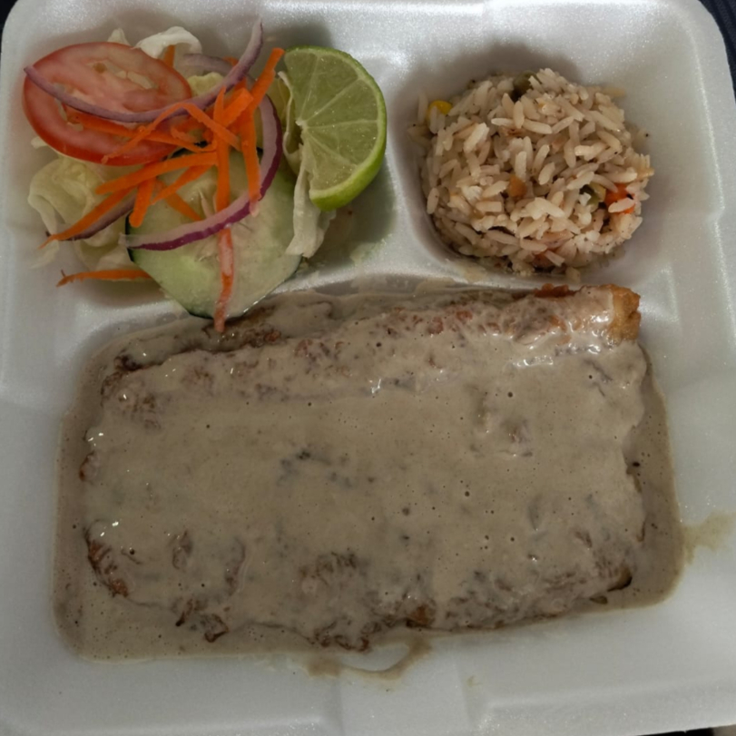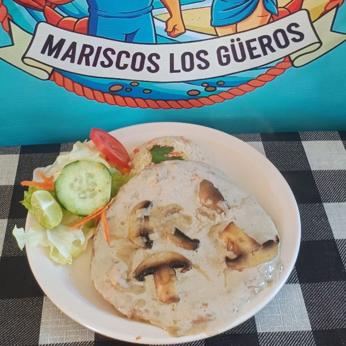 Filete bañado en salsa cremosa elaborada con champiñones, perfecta para realzar el sabor incluye ensalada (lechuga, tomate, cebolla morada y zanahoria rallada), arroz a la jardinera, tortillas y limón