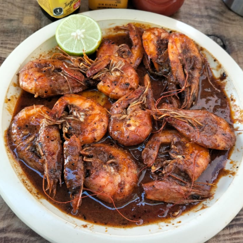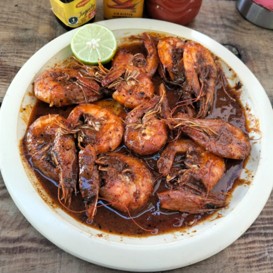 Camarones con cáscara salteados en mantequilla, cebolla y ajo, bañados en salsa picante (3 chiles diferentes), incluye ensalada (lechuga, tomate, cebolla morada, pepino y zanahoria rallada), arroz a la jardinera, limón y tortillas