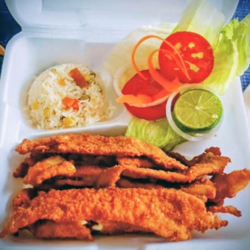 Puntas de filete en tiras grandes, crujientes por fuera y jugosas por dentro, acompañados de ensalada (lechuga, tomate, cebolla morada, pepino y zanahoria rallada), incluye arroz a la jardinera, tortillas, limón y salsa pulpito