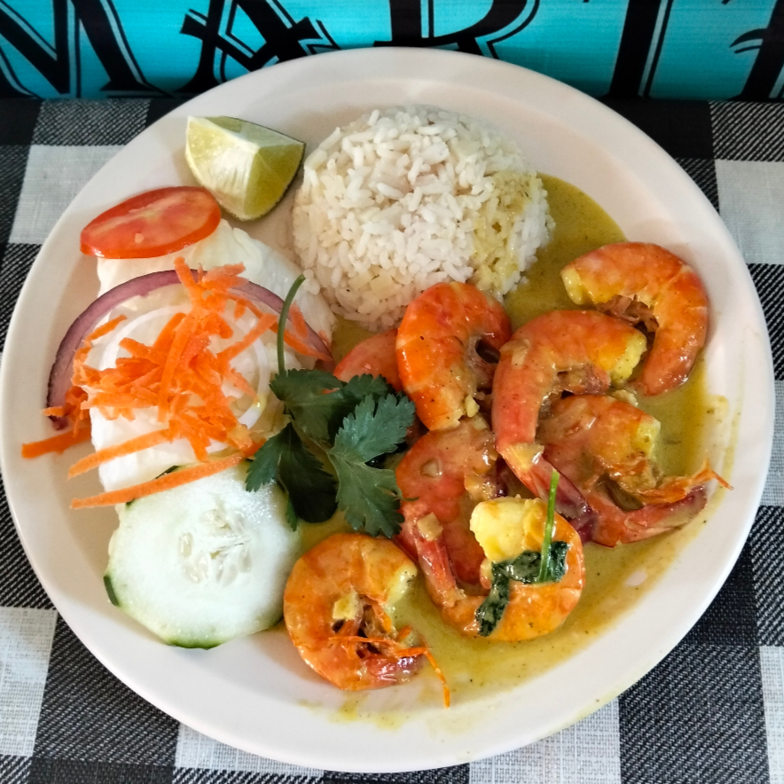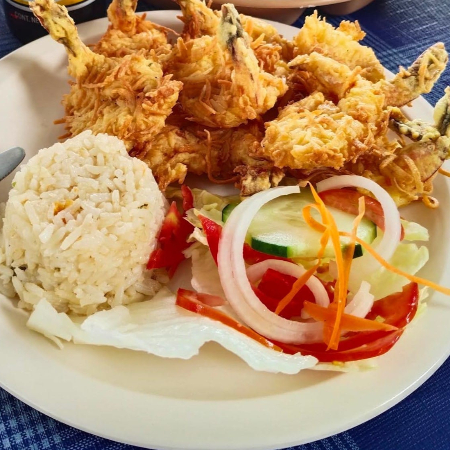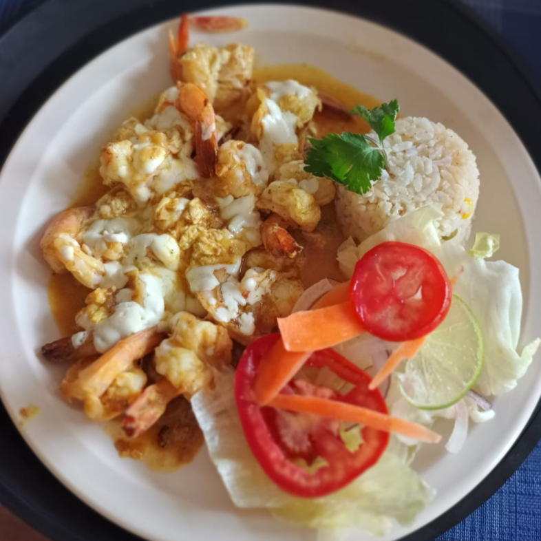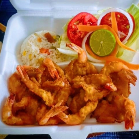 Camarones empanizados en pan molido cubiertos de coco rallado, acompañados en salsa de mango habanero natural, incluye ensalada (lechuga, tomate, cebolla, pepino, zanahoria rallada), arroz a la jardinera, limón y salsa pulpito