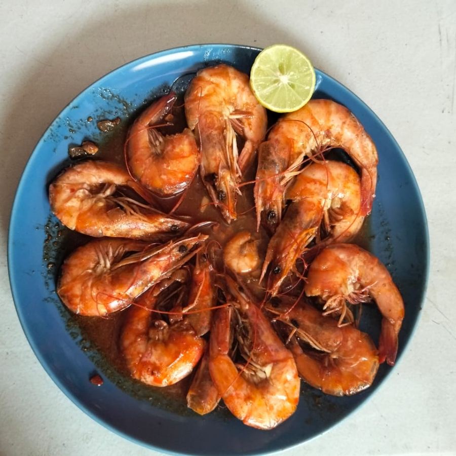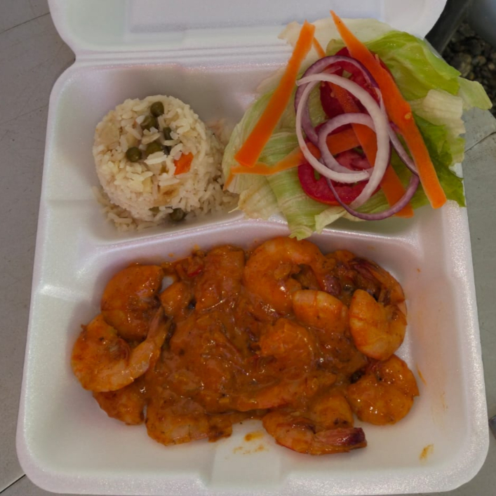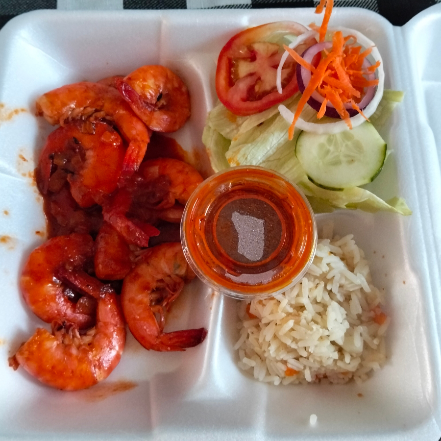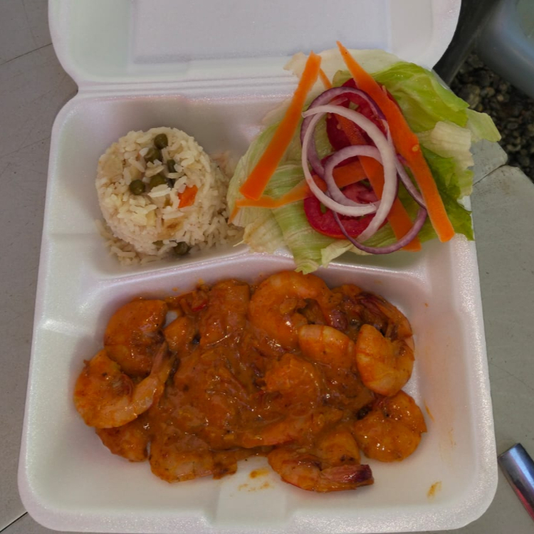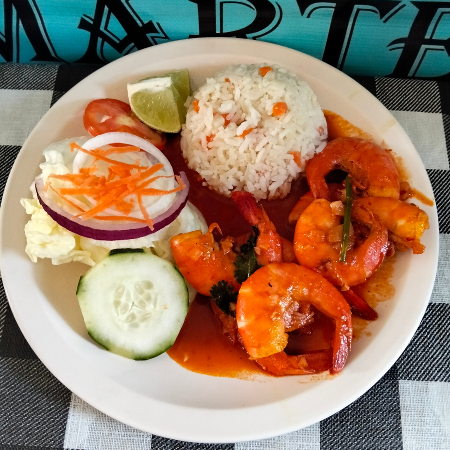 Camarones con cascara bañados en salsa de la casa segun nivel de picor 1,2,3,4,5), incluye ensalada (lechuga, tomate, cebolla, pepino, zanahoria rallada), arroz a la jardinera, limón y tortillas