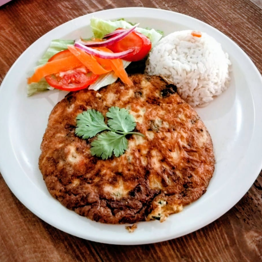 Torta de camarón bañada en salsa de champiñones , incluye ensalada (lechuga, tomate, cebolla morada, pepino y zanahoria rallada), arroz a la jardinera, tortillas, salsa pulpito y limón.