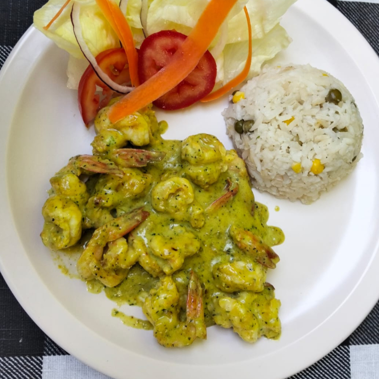 Camarones con cascara salteados en cebolla, ajo y mantequilla, cubiertos en salsa de cilantro cremosa, incluye ensalada (lechuga, tomate, cebolla, pepino, zanahoria rallada), arroz a la jardinera, limón, salsa pulpito y tortillas