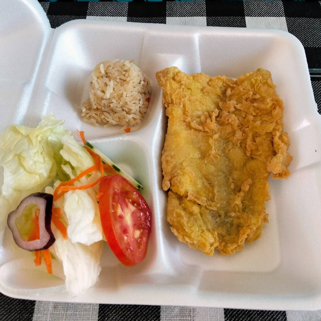 Filete de pescado lampreado, ideal para disfrutar en tacos o solo, acompañados de ensalada (lechuga, tomate, cebolla morada, pepino, zanahoria rallada) incluye arroz a la jardinera, salsa pulpito, limón y tortillas