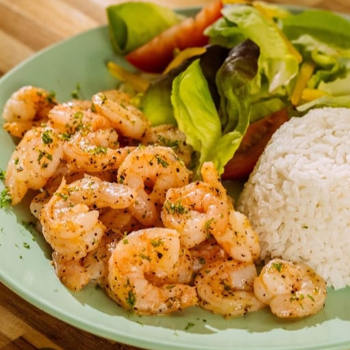 Camarones con cascara salteados en mantequilla con cebolla y ajo, bañados en salsa picante, incluye ensalada (lechuga, tómate, cebolla, pepino, zanahoria rallada), arroz a la jardinera, limón y tortilla.
