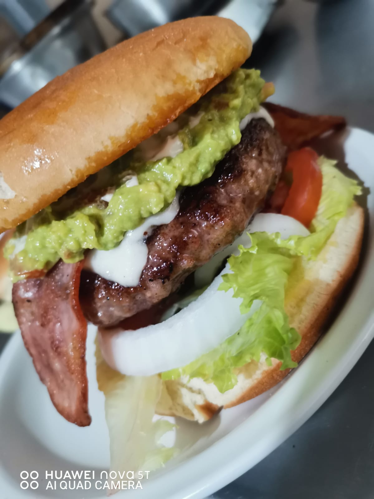 Carne de 200grs, queso tipo manchego, tocino, guacamole, lechuga, tomate, cebolla.