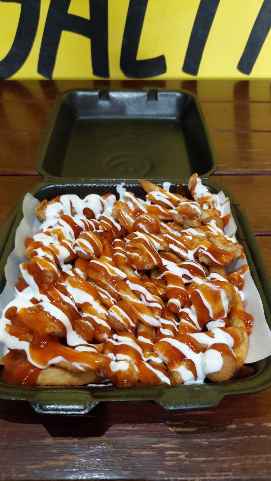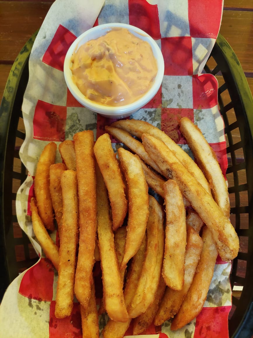 (400grs) Papas a la francesa, 10 palomitas de pollo, 8 bolitas queso, ranch y 3 salsas a elegir (Mango habanero, BBQ o buffalo).