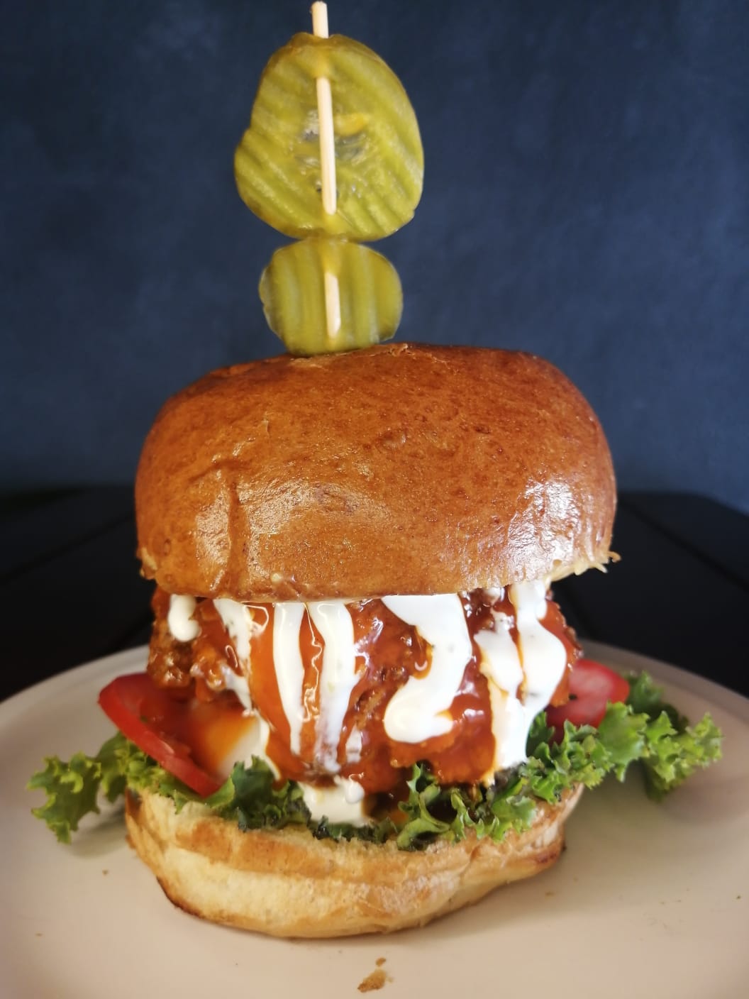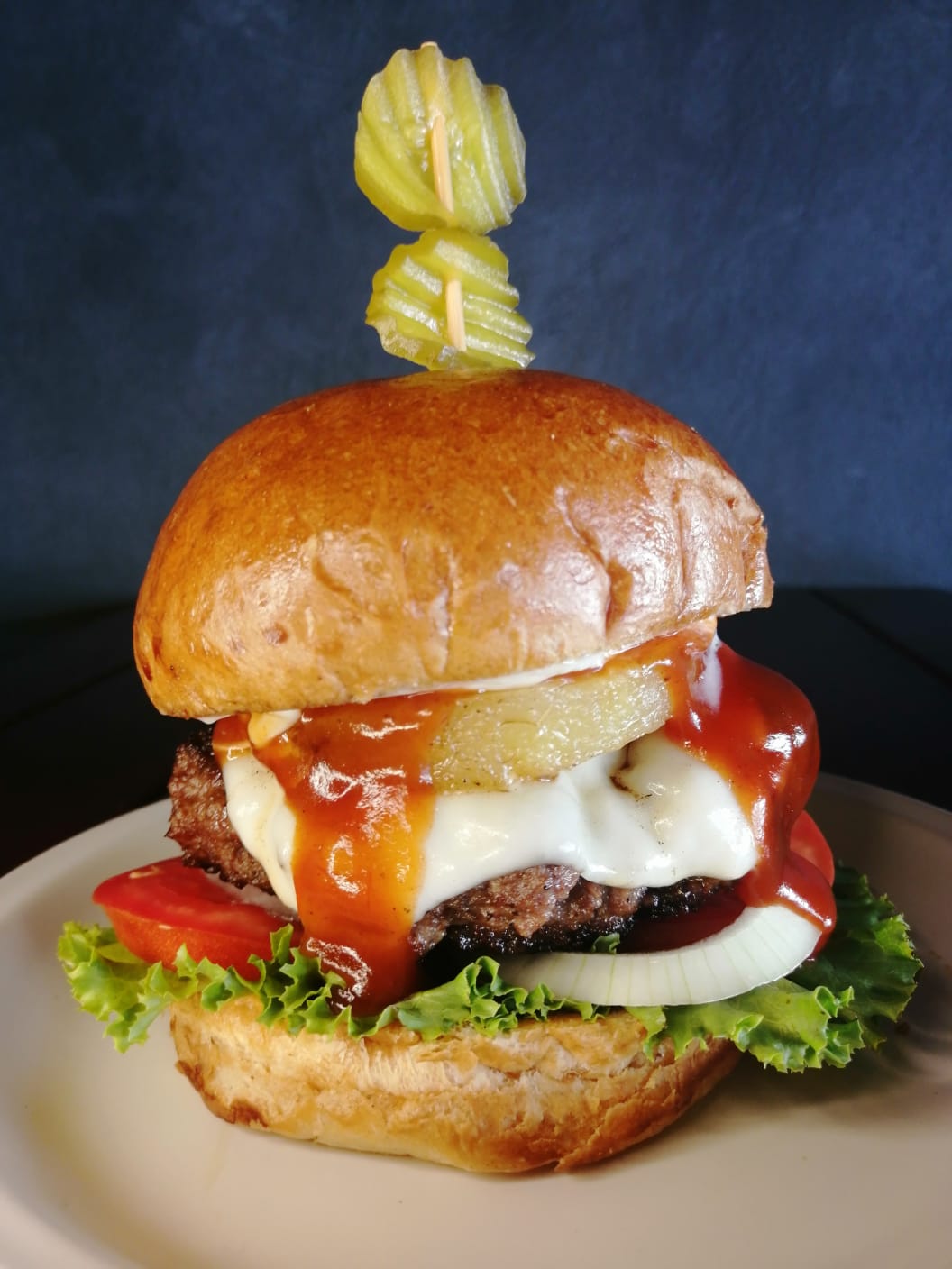 Con 200grs de carne, queso manchego, piña, BBQ, lechuga, tomate y cebolla.