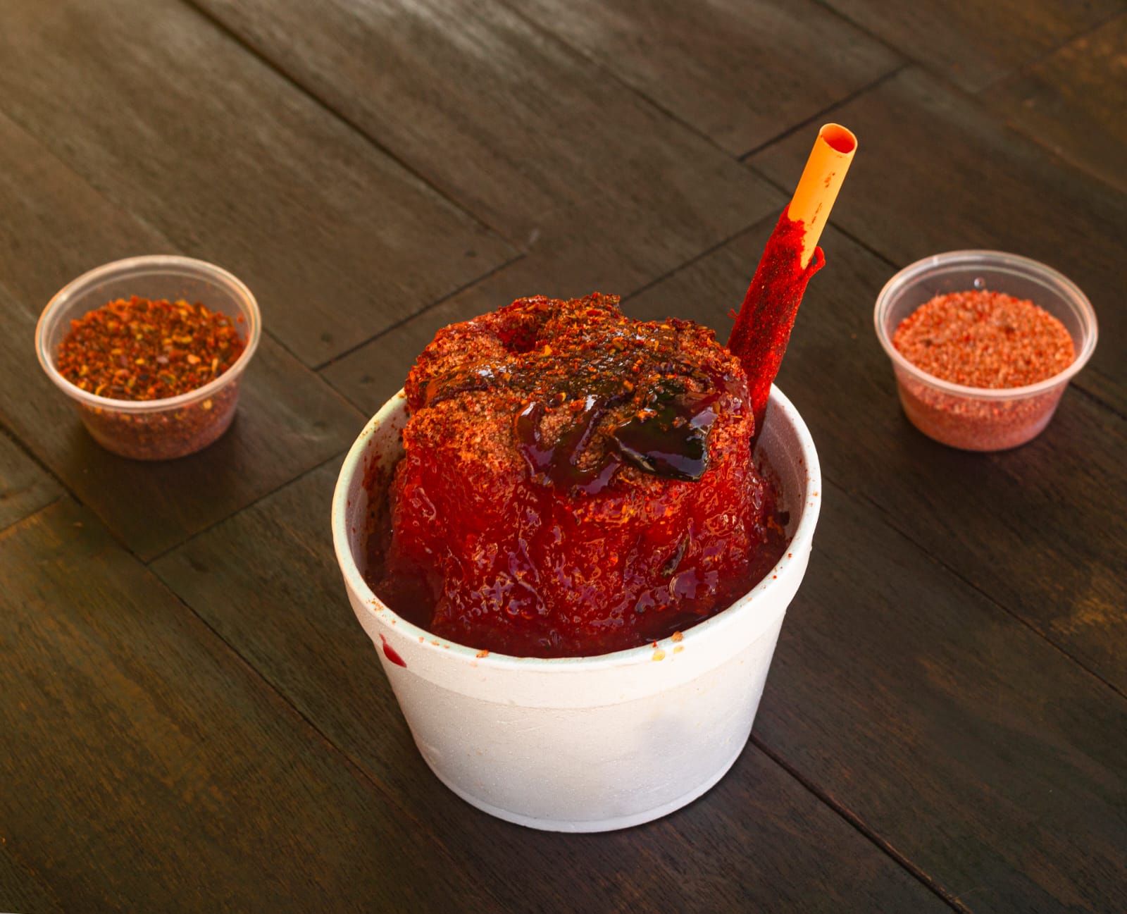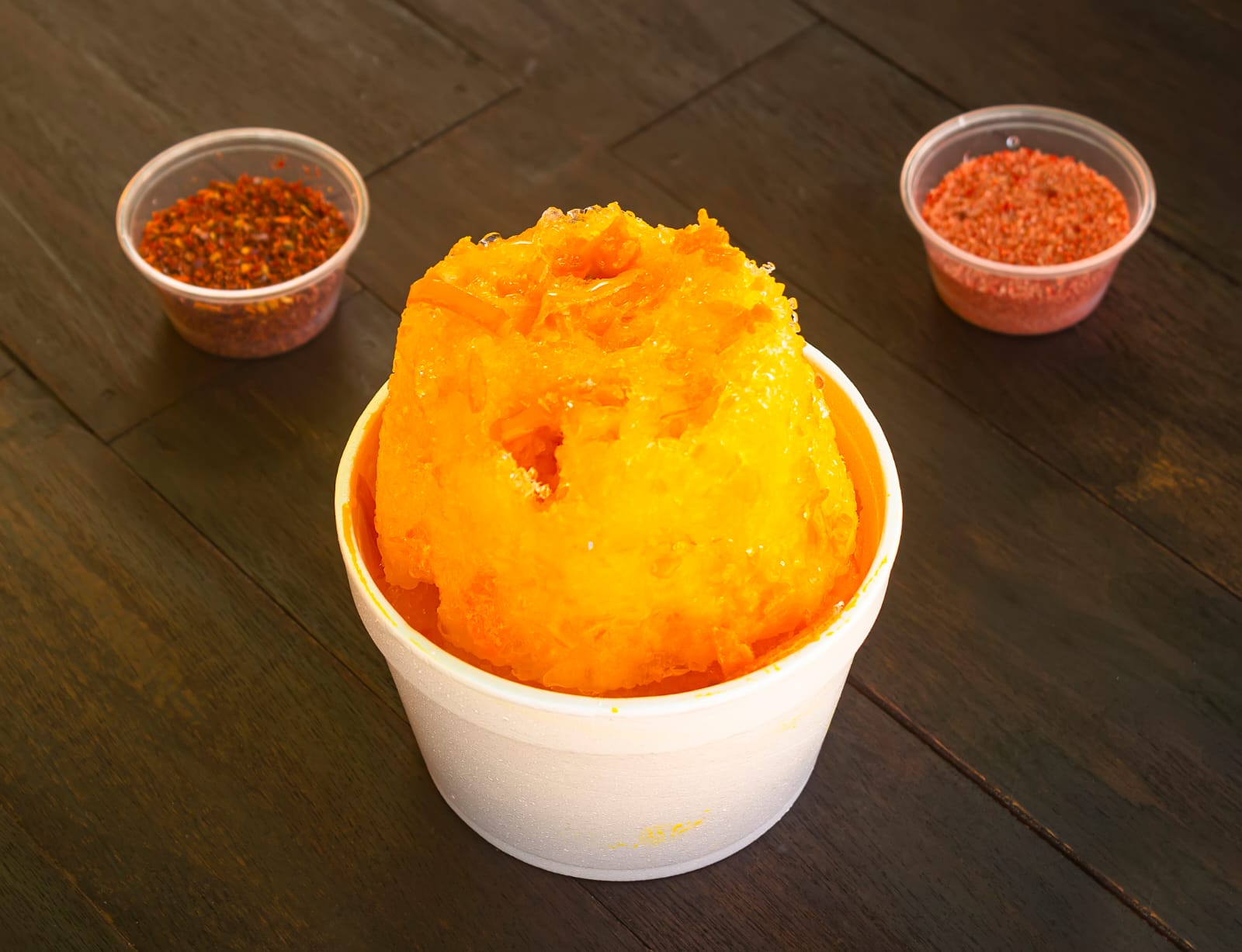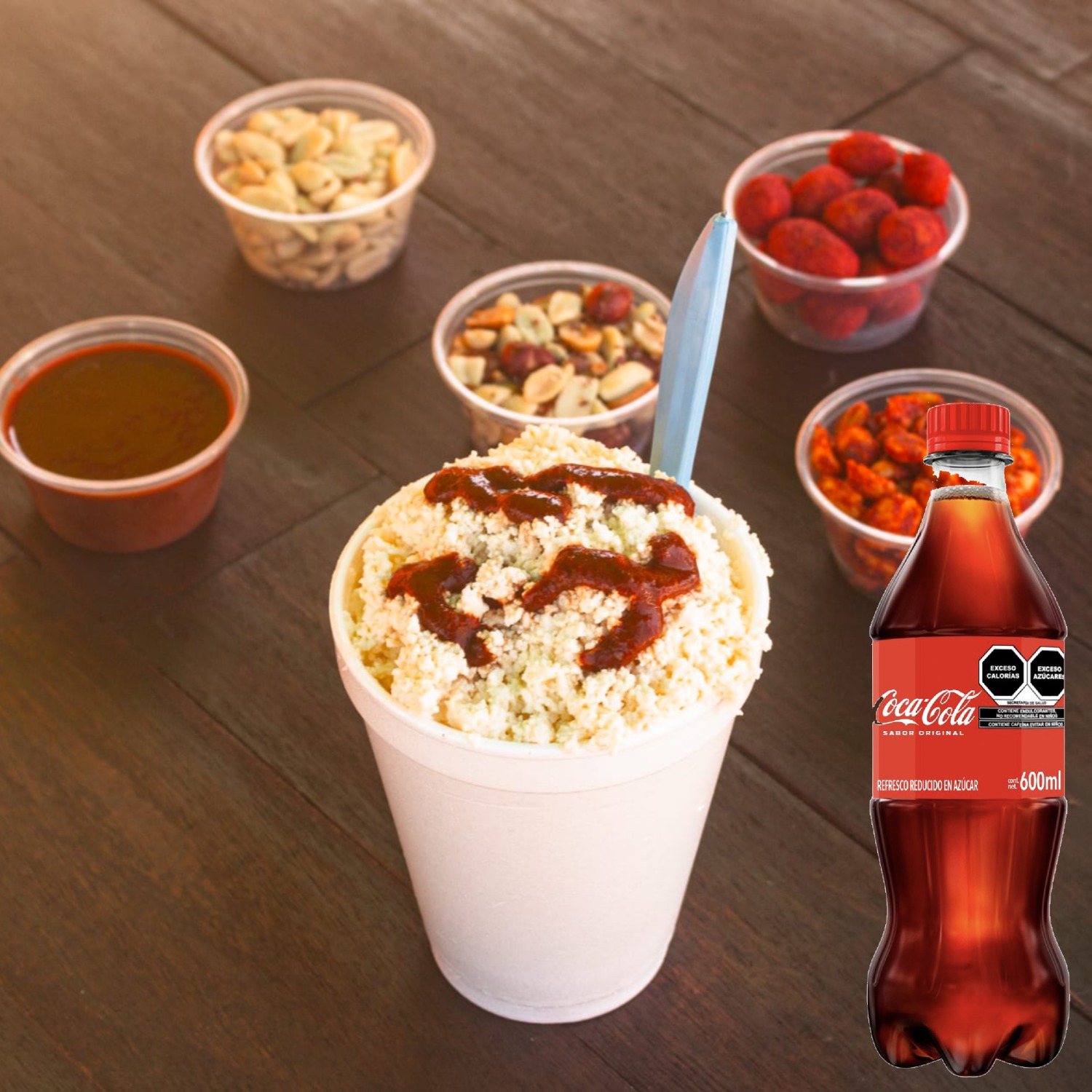 Hielo raspado, chamoy, miguelito, pulpa de chamoy, banderilla, gomitas enchiladas y dulces de varios sabores y jarabe natural a elegir: mango, fresa, tamarindo piña y chamoy.