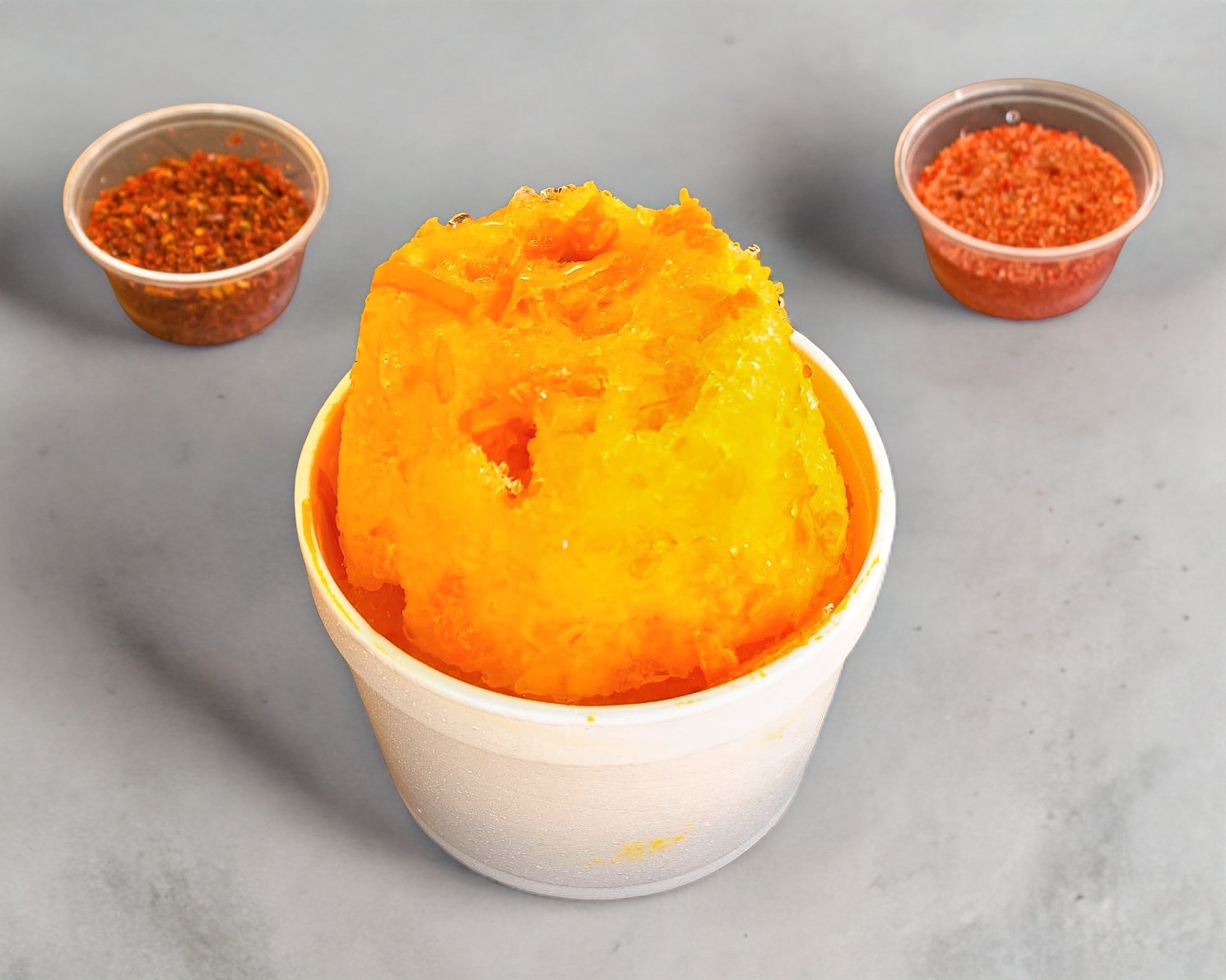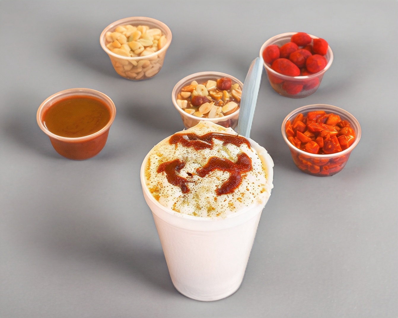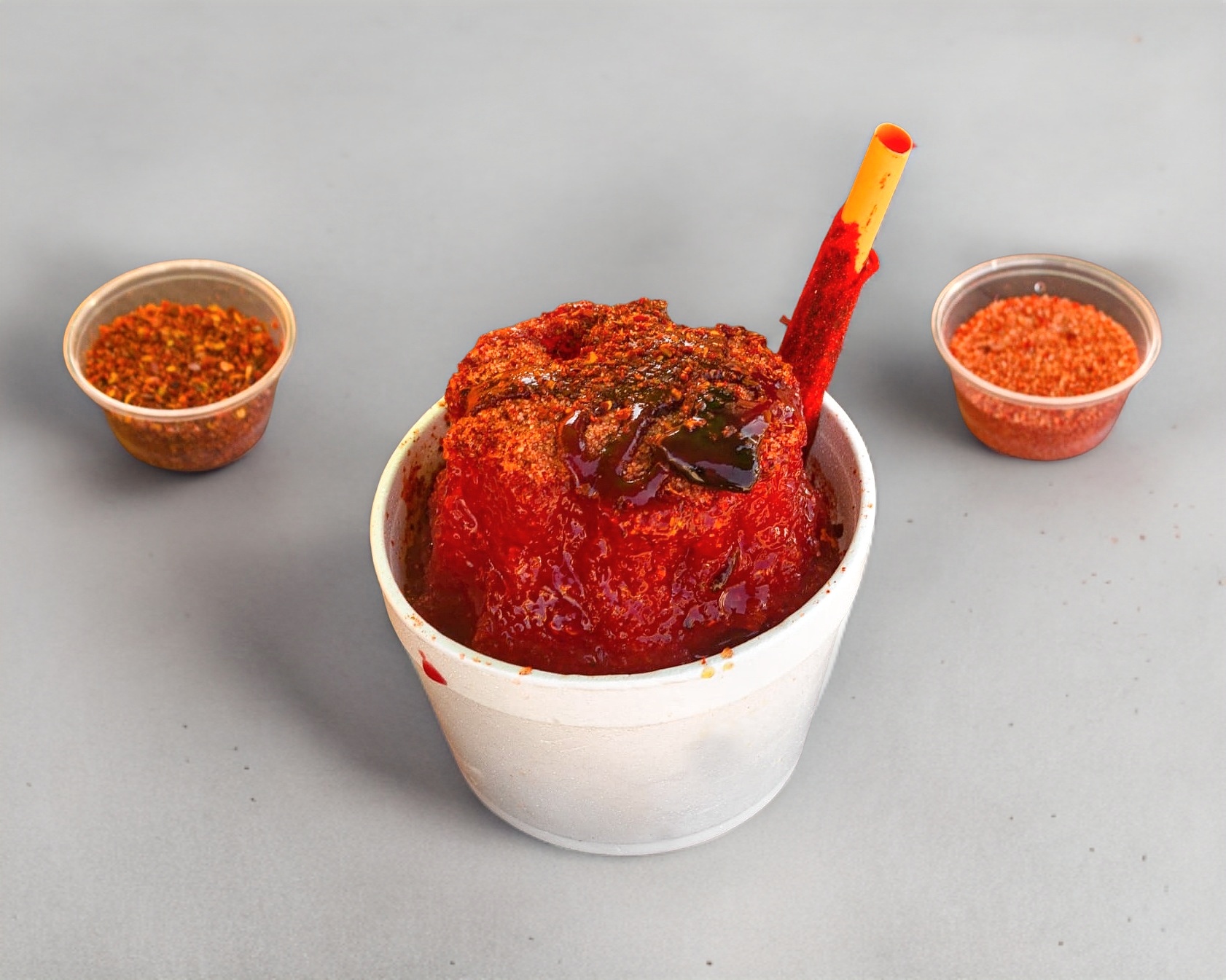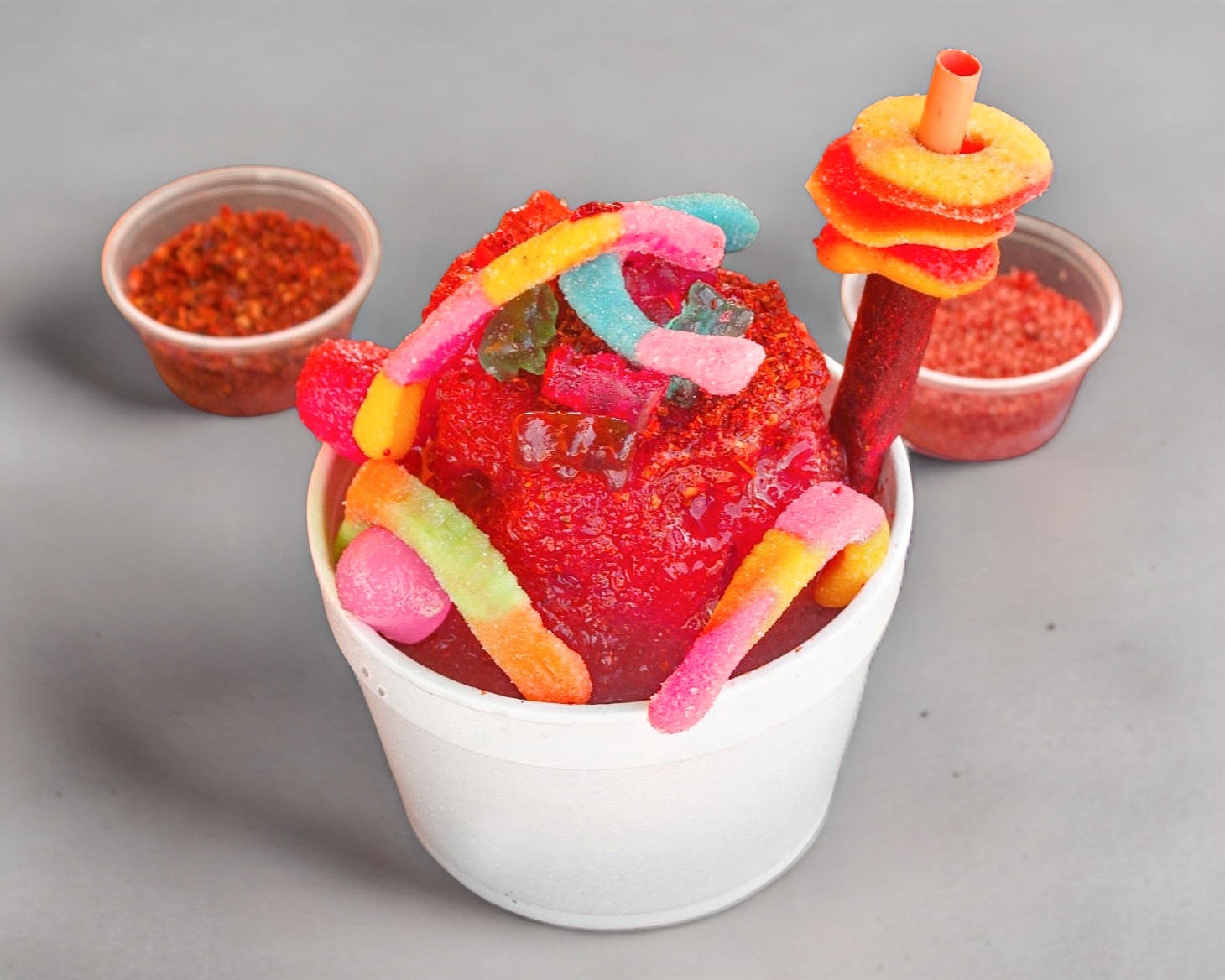 Hielo raspado, chamoy, miguelito, pulpa de chamoy, banderilla, gomitas enchiladas y dulces de varios sabores y jarabe natural a elegir: mango, fresa, tamarindo piña y chamoy.