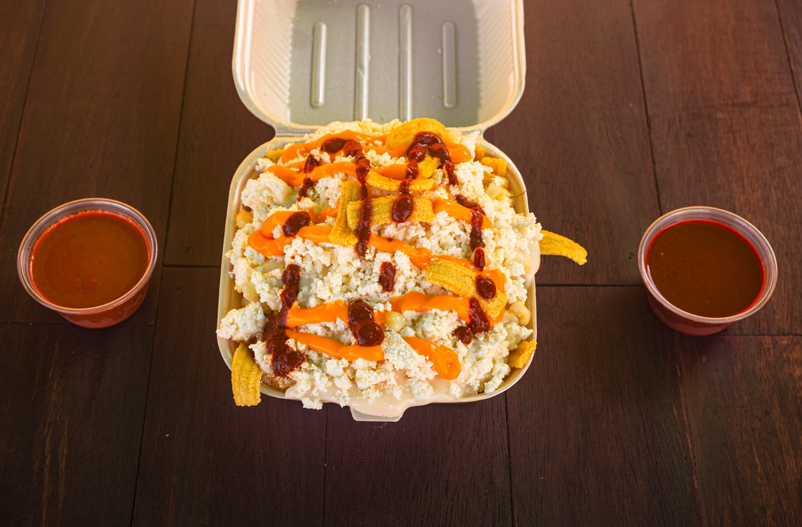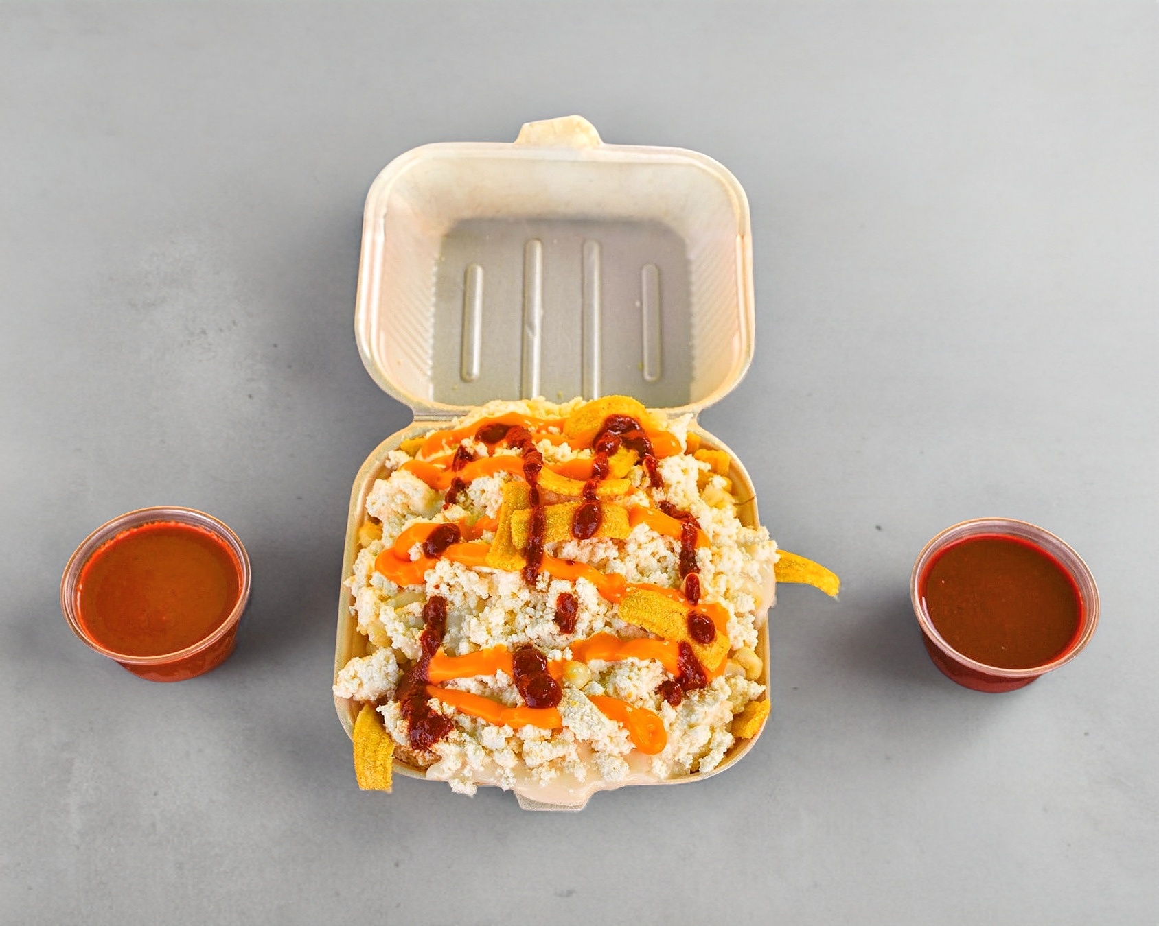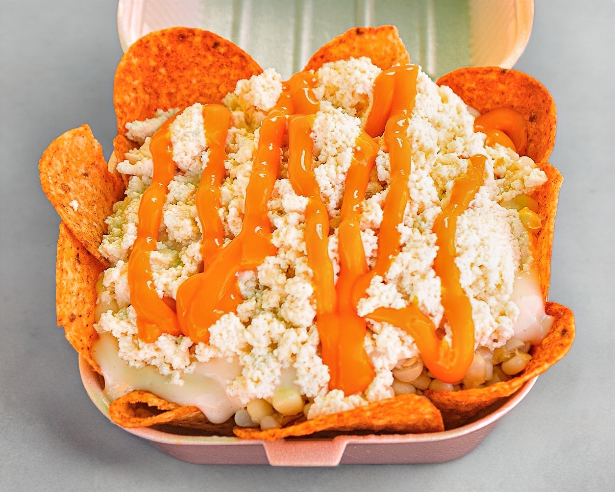 Elote desgranado tierno, mayonesa, mantequilla, queso blanco fresco, queso amarillo papitas espolvoreadas, papitas tipo Dorito nacho y Rancheritos.