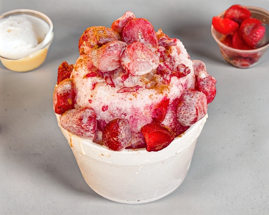 Hielo raspado, chamoy, fresas naturales picadas, Lechera, canela y jarabe de frutas a elegir: mango, fresa, tamarindo piña y chamoy.