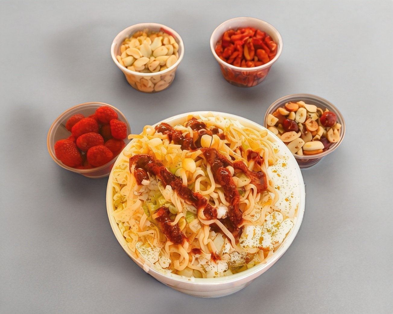 Sopa instantánea Maruchan, elote desgranado tierno, mayonesa, mantequilla, queso blanco fresco, limón, (salsas y cacahuates se mandan en contenedores aparte).