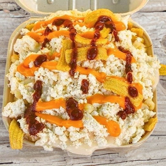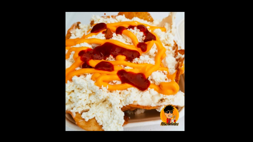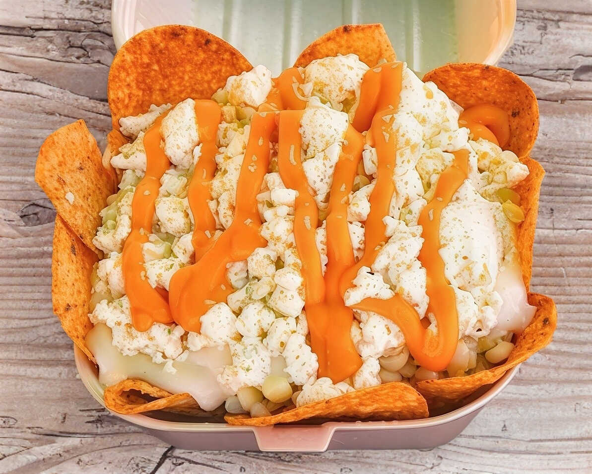 Elote desgranado, mayonesa, mantequilla, queso blanco, queso amarillo, papitas espolvoreadas, papitas tipo dorito nacho y rancheritos.