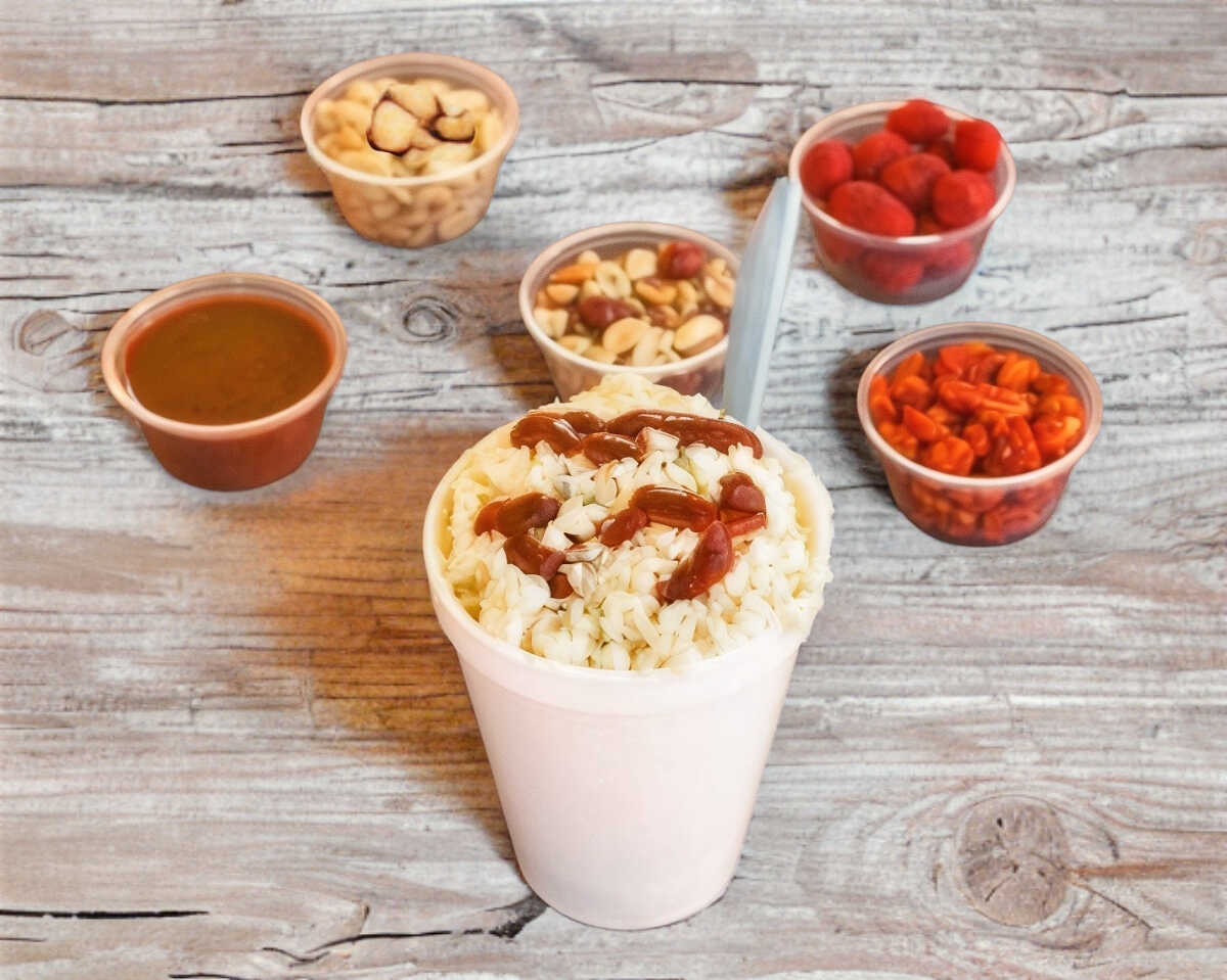 Sopa instantanea maruchan, elote desgranado tierno, mayonesa, mantequilla, queso blanco, limón, las salsas y cacahuates se ponen en contenedores aparte.