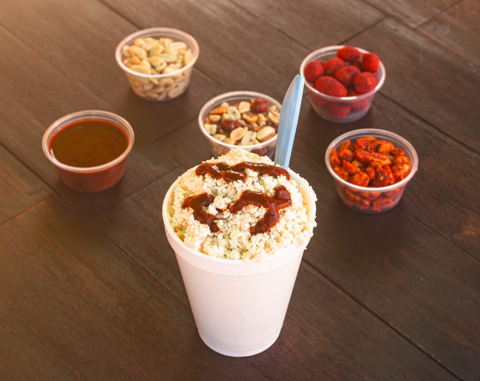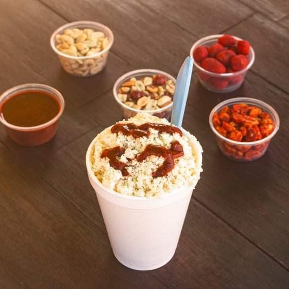 1/2 Litro Elote desgranado mayonesa mantequilla queso blanco fresco y salsas y cacahuates se le ponen aparte´.