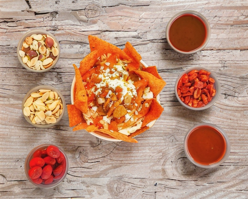 Doritos nachos preparados con maíz tiernito aderezo mantequilla queso blanco fresco queso amarillo salsas y cacahuates se envían aparte