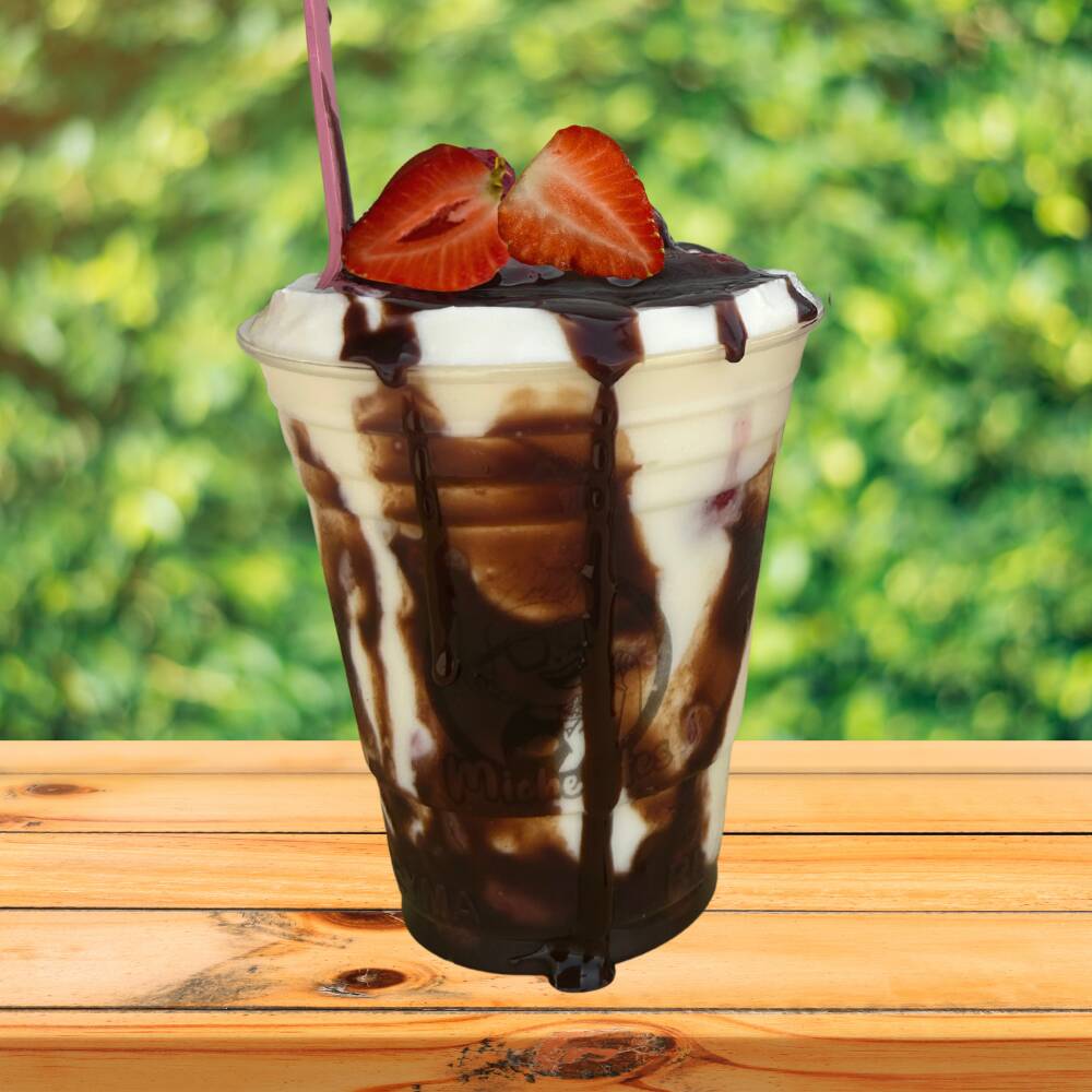 Fresas naturales frescas con crema y chocolate liquido Hersheys. Vaso de plastico de 12 onzas