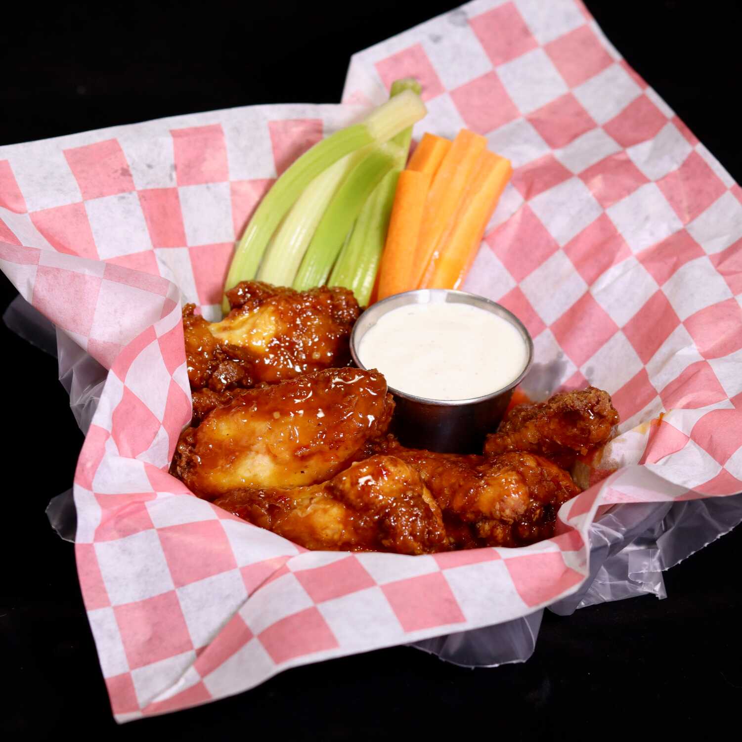Incluye: 1 Salsa a escoger, 2 oz. aderezo, apio y zanahoria