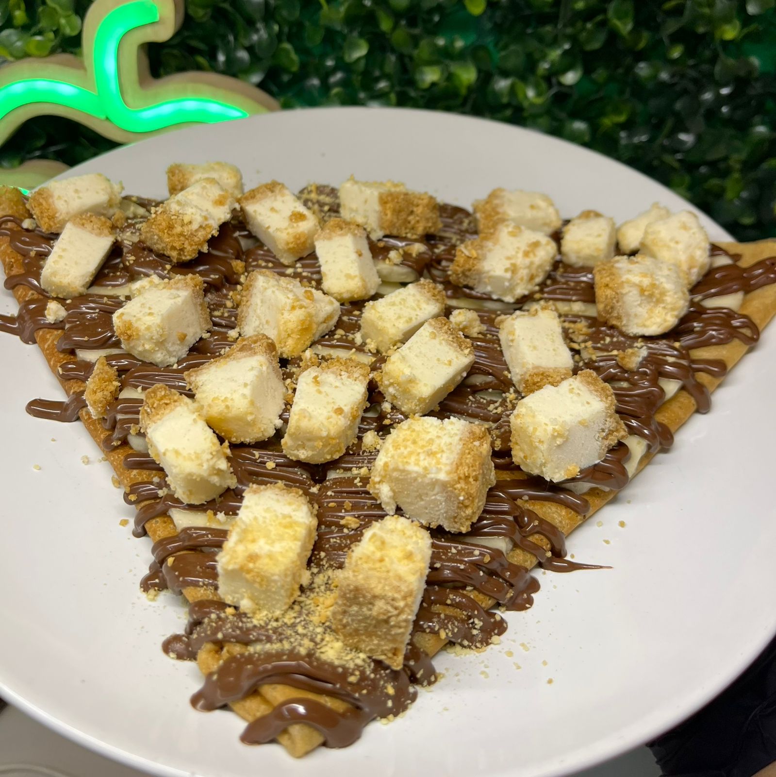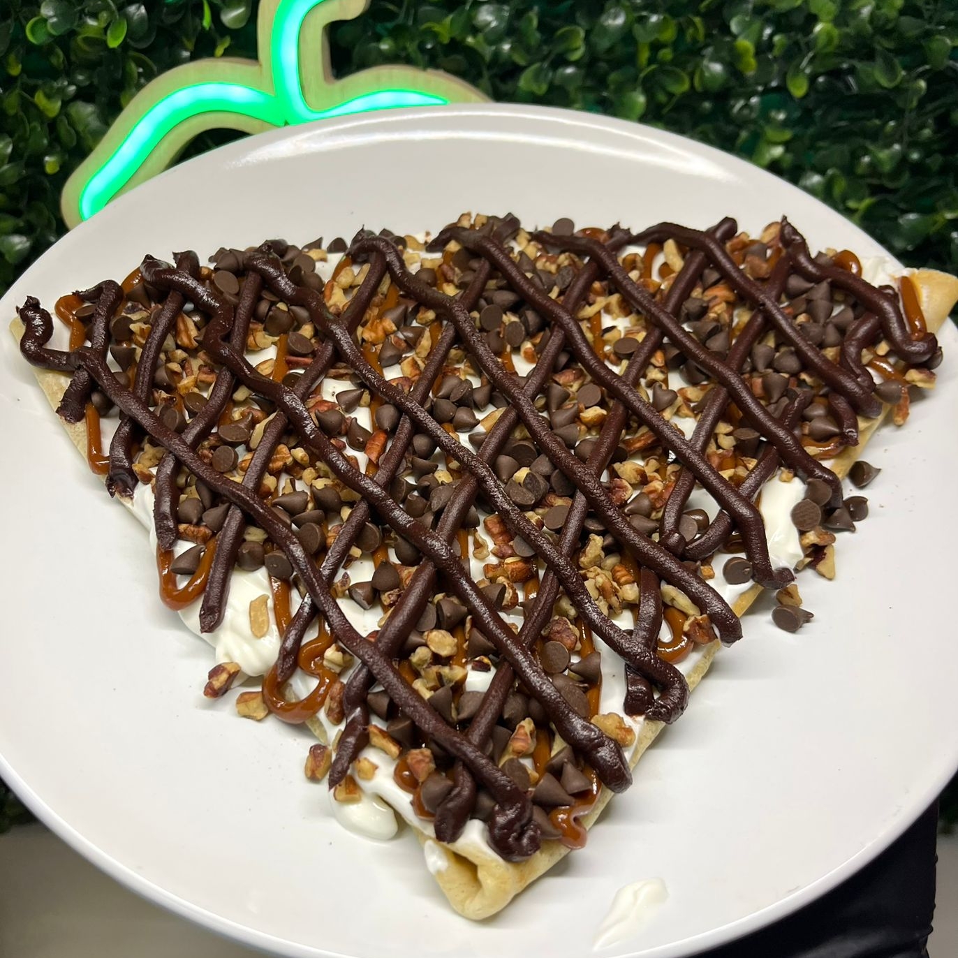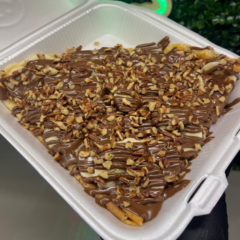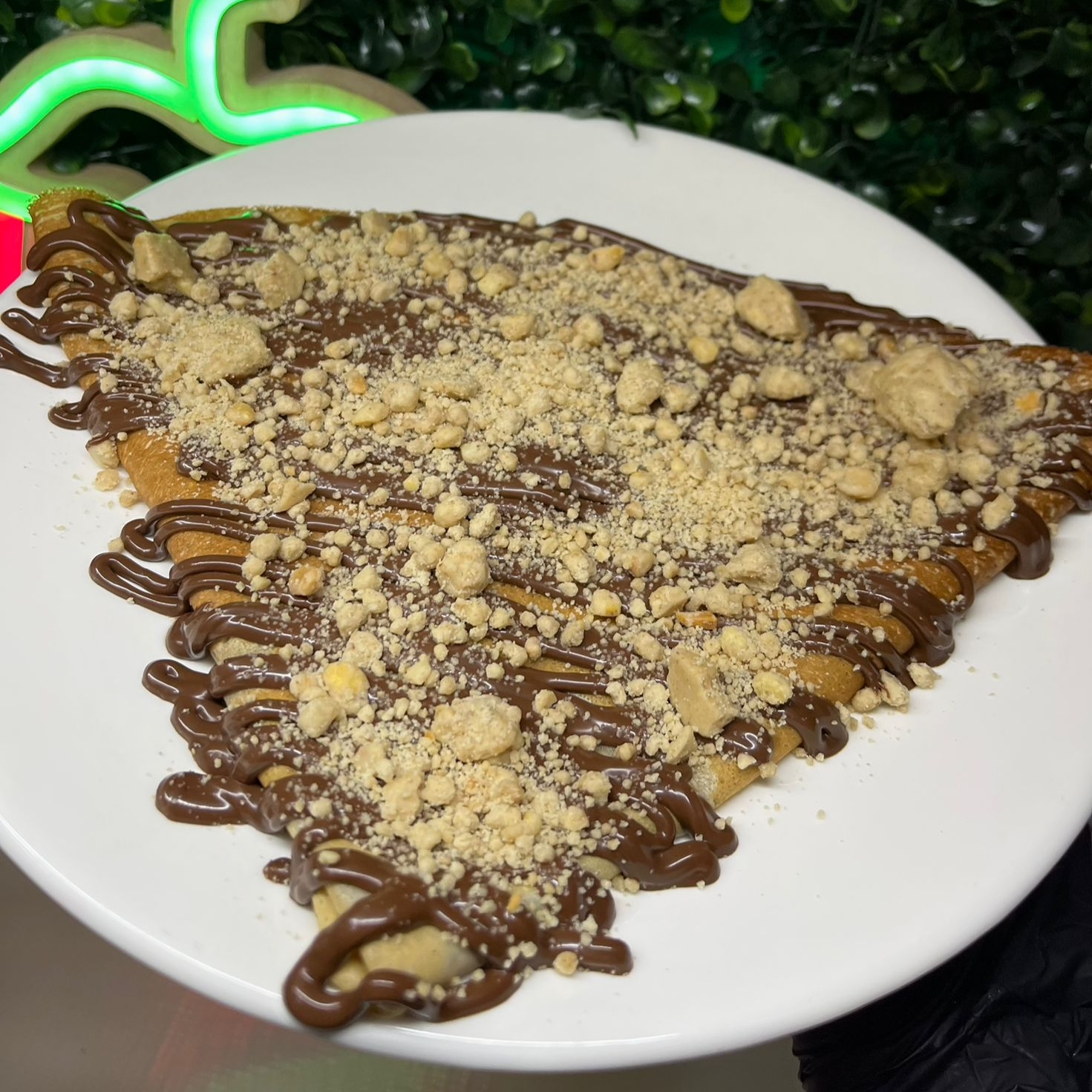 Crepa de 40 cm, con Philadelphia, dulce de leche, nuez, Nutella y chispas de chocolate.