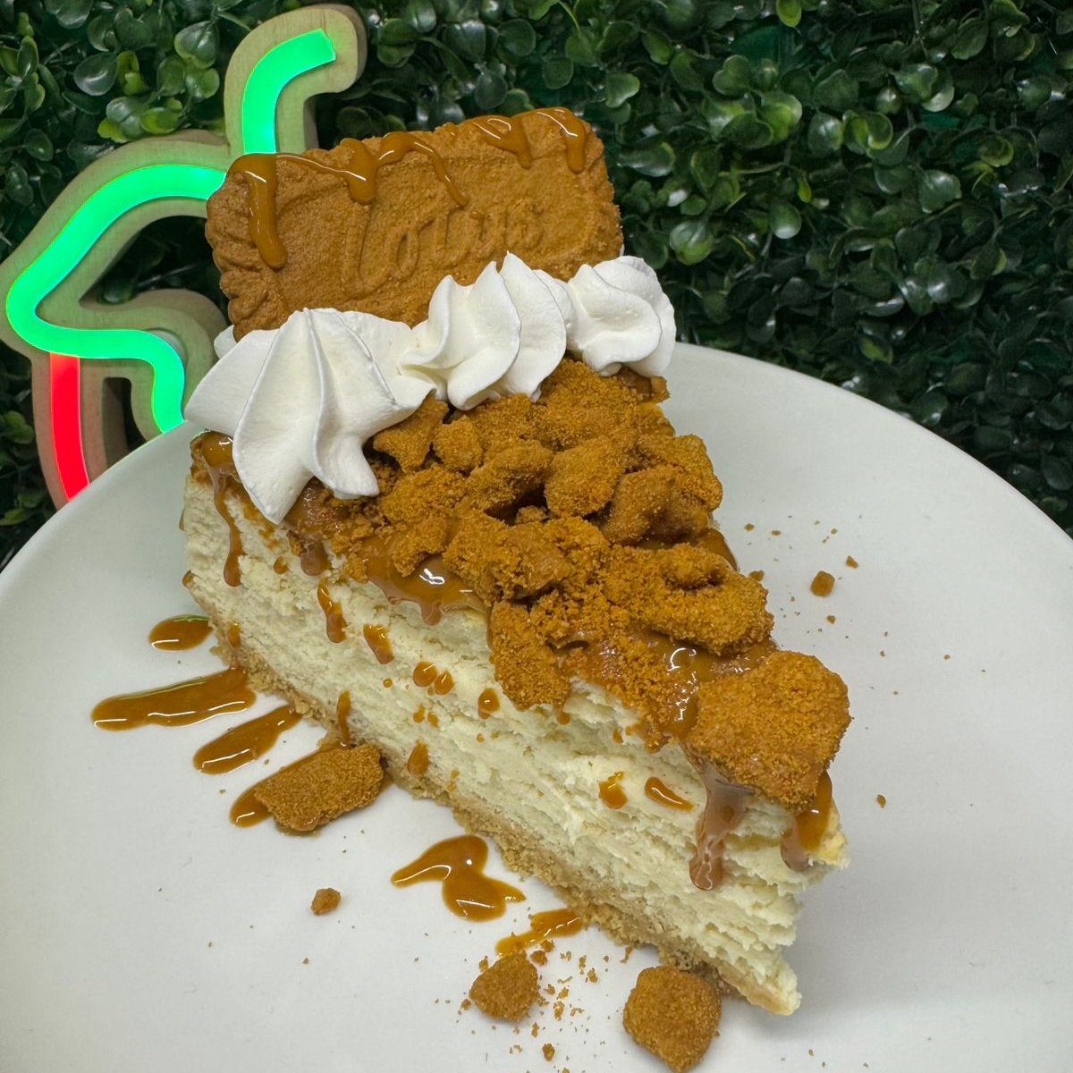 Rebanada de cremoso cheesecake, con caramelo Lotus, trozos de galleta Lotus, crema batida y una galleta Lotus.