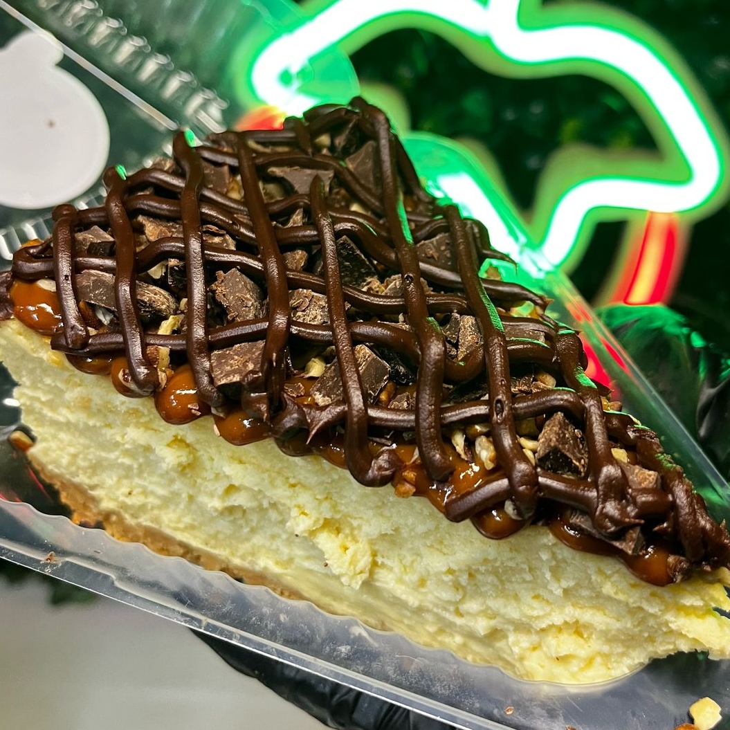 Rebanada de cremoso cheesecake de Philadelphia, con base de galleta María Dorada, cubierto con dulce de leche, nuez, trozos de chocolate Turín semi amargo y ganache de chocolate Turín.