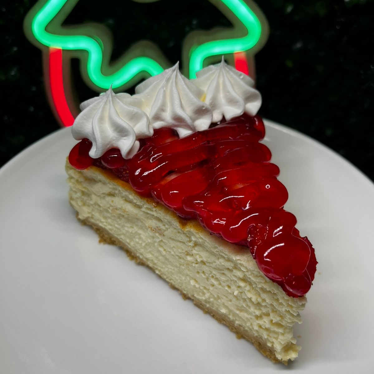 Deliciosa rebanada de cremoso cheesecake, con base de galleta María dorada, decorado con fresa natural, mermelada de fresa y crema batida.