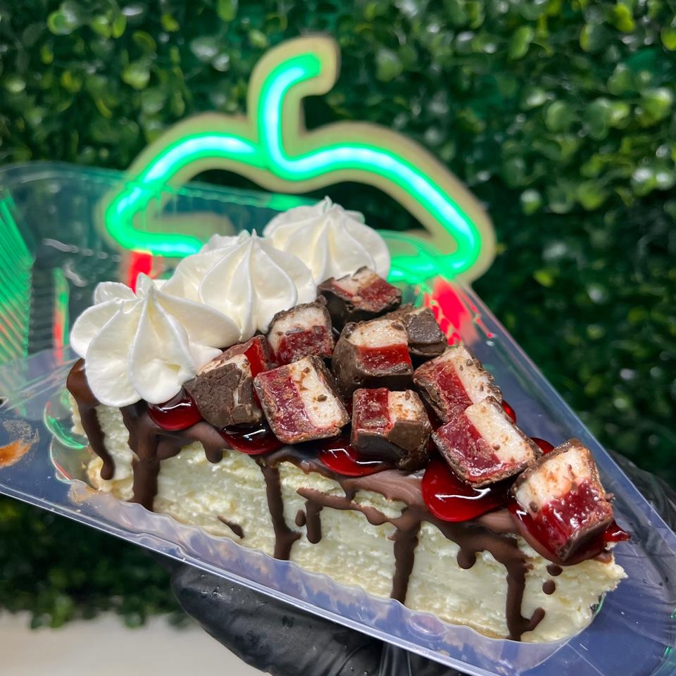 Deliciosa rebanada de cremoso cheesecake, con base de galleta María dorada, decorado con chocolate Turín, jalea de fresa, trozos de bubulubu y crema batida.