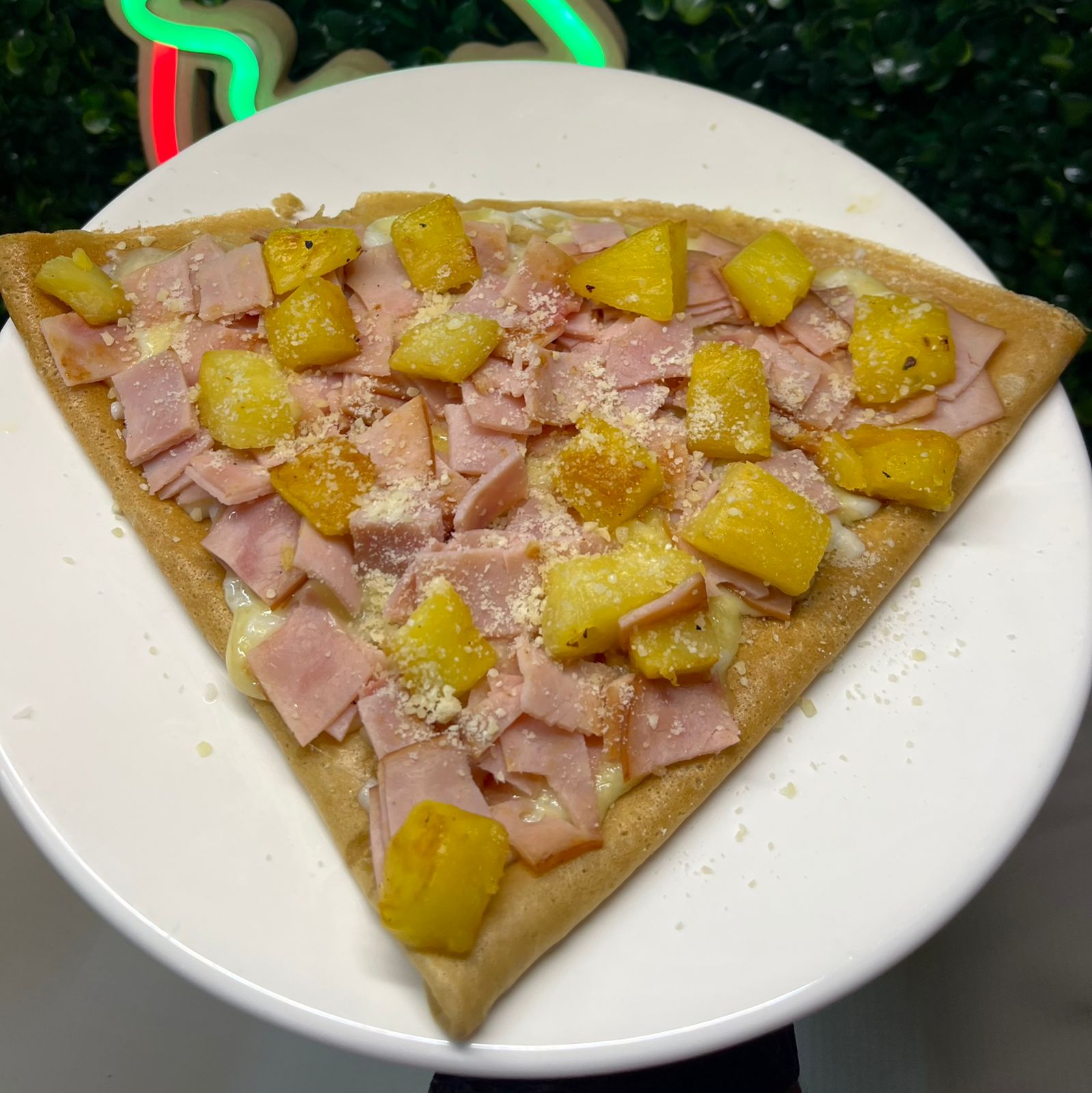 Crepa de 40 cm, masa de la casa con salsa de tomate, peperoni, piña, jamón, queso parmesano y queso mozzarella.