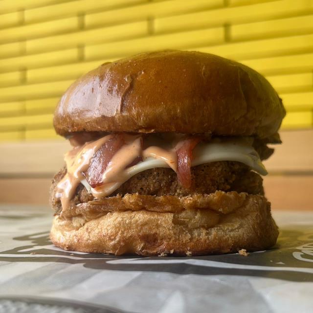 BURGER CON PAN BRIOCHE, PECHUGA DE POLLO EMPANIZADO, QUESO SUIZO, TOCINO Y ADEREZO MR BROWN.
