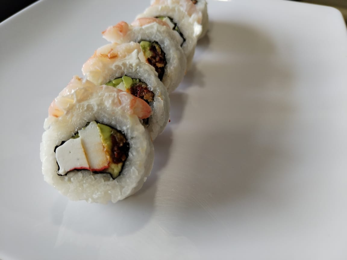 Por dentro camarón , pepino, aguacate y phiadelphia, por fuera ajonjolí tostado.