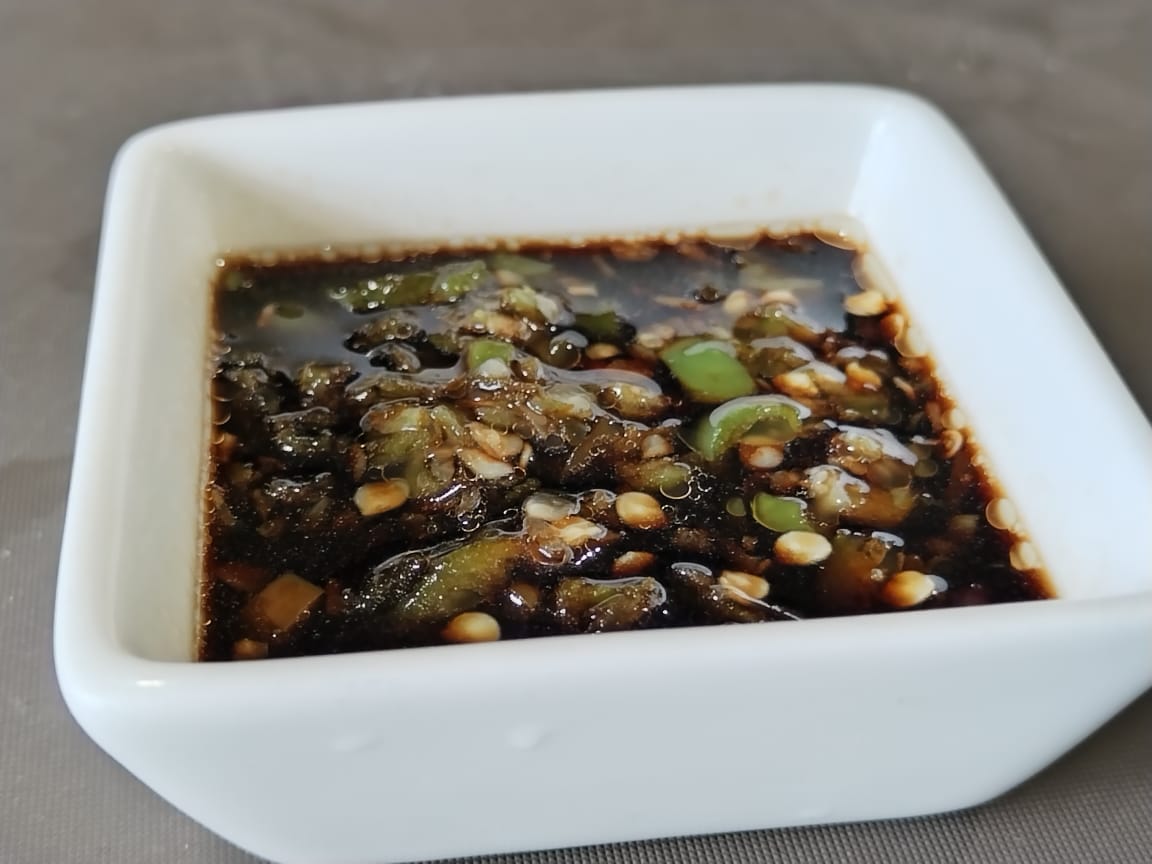 Deliciosos chiles toreados bañados en salsa de soya.